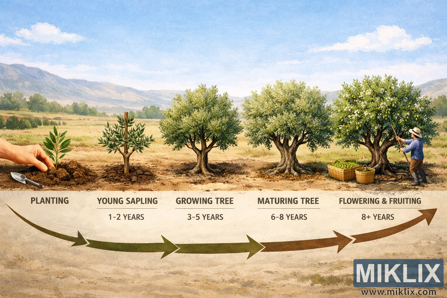Imagen: Cronología del crecimiento del olivo desde la plantación hasta la cosecha