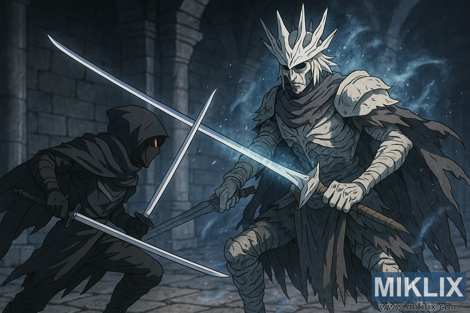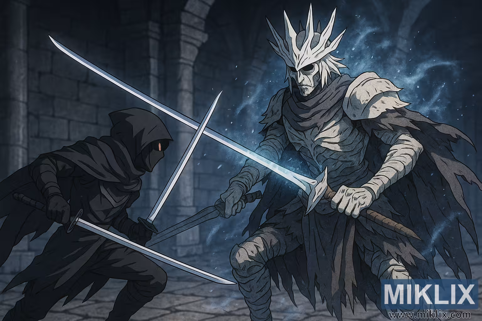La composición congela el instante previo al impacto: tres espadas convergen, cada una reflejando el movimiento de la otra. El contraste entre la sombra y la escarcha, entre el asesino y el guardián ancestral, crea una dramática tensión visual. La silueta oscura del jugador y su ojo rojo sangre contrastan con la palidez fantasmal y el aura gélida de Zamor, enfatizando el choque entre la vida y la muerte, el calor y el frío, y la determinación mortal contra el deber inmortal. La escena combina el movimiento dinámico del anime, la atmósfera al estilo Soulsborne y la simetría temática, capturando la intensidad de un duelo librado en silencio bajo una piedra ancestral.