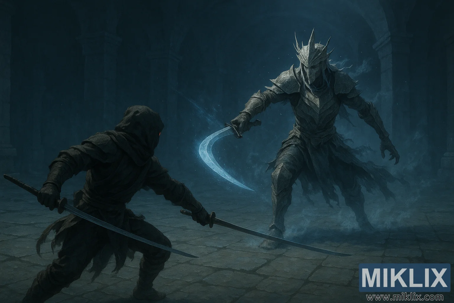 El personaje del jugador, ataviado con la icónica armadura Black Knife, se sitúa a la izquierda, visto parcialmente desde atrás, en una postura dinámica que transmite un movimiento urgente. La figura encapuchada se inclina hacia adelante, con las rodillas flexionadas y el cuerpo ligeramente girado hacia la izquierda, preparándose para atacar o esquivar. Su capa y armadura de capas, confeccionadas en tela oscura y texturizada que absorbe la gélida luz ambiental, se adaptan naturalmente al movimiento. Un único ojo rojo brilla bajo la capucha, creando un marcado contraste visual con los tonos azul grisáceos. Cada mano sostiene una espada tipo katana: la izquierda se extiende hacia atrás en un ángulo defensivo, mientras que la derecha apunta hacia adelante, baja y lista. Ambas espadas captan finos destellos de azul hielo, realzando su filo y movimiento.