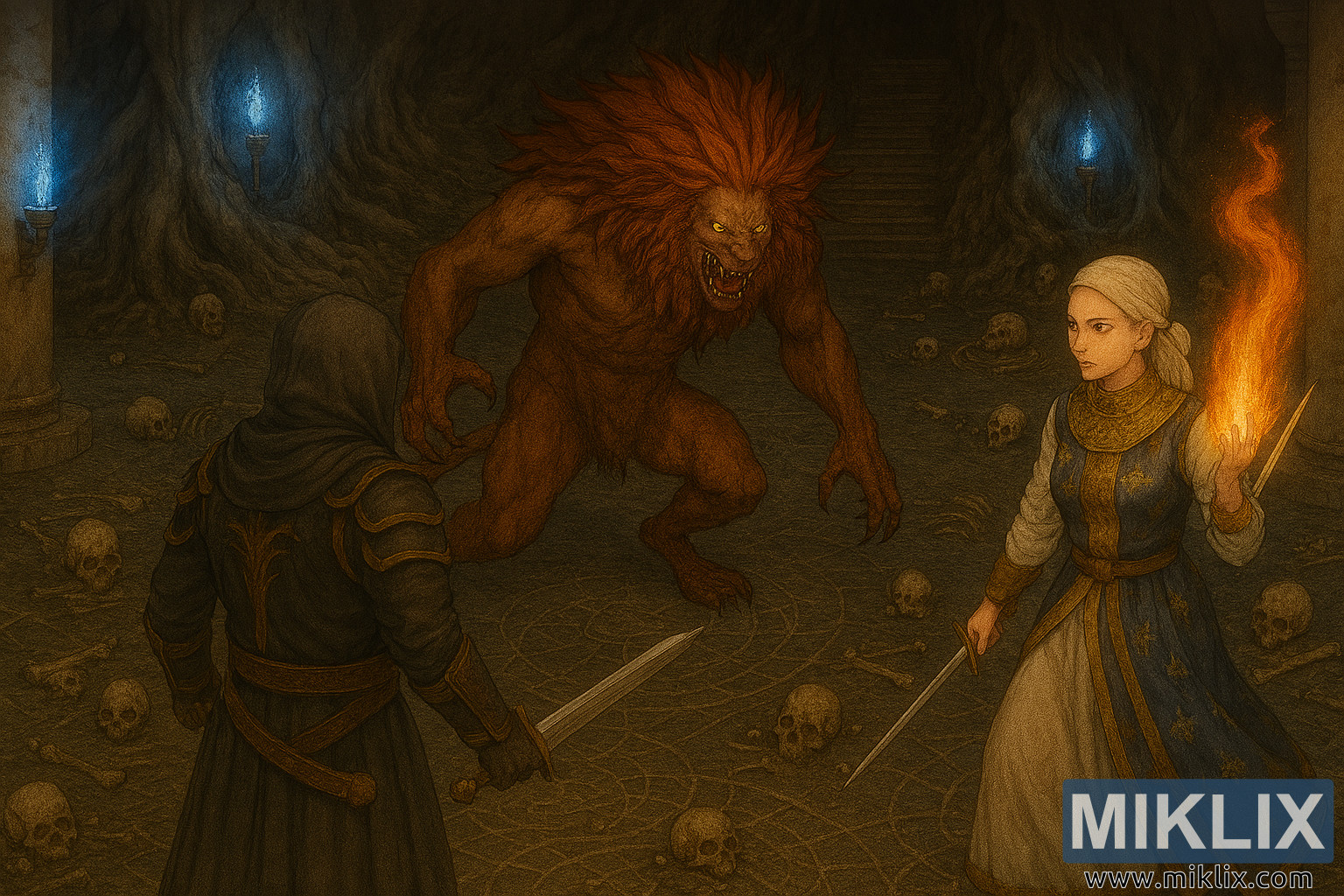 El entorno es profusamente detallado: el suelo de piedra está grabado con patrones circulares y repleto de cráneos y huesos humanos. Dos altos pilares de piedra flanquean la escena, cada uno coronado por una antorcha azul que emite una luz fría y parpadeante. Tras los personajes, enormes raíces nudosas de árboles se enroscan en las paredes y el techo, y una escalera excavada en la roca se pierde en la sombra.