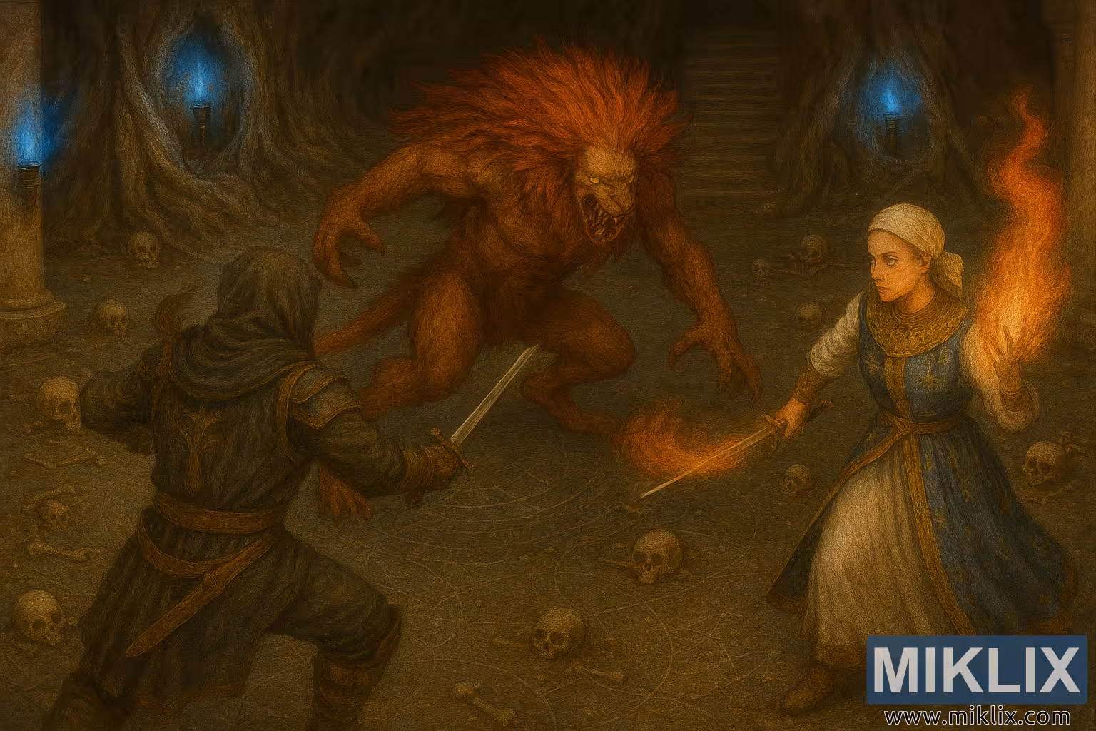 La composición crea una tensión triangular entre los tres personajes, con líneas diagonales creadas por armas, extremidades y efectos de llamas. La iluminación contrasta los cálidos tonos del fuego y la melena con los fríos tonos de la luz de las antorchas y la piedra. Las texturas (pelaje, tela, metal y piedra) están representadas con precisión, realzando el realismo y la profundidad. La imagen evoca temas de valentía, misticismo y confrontación violenta, convirtiéndola en un poderoso homenaje al oscuro mundo de fantasía de Elden Ring.