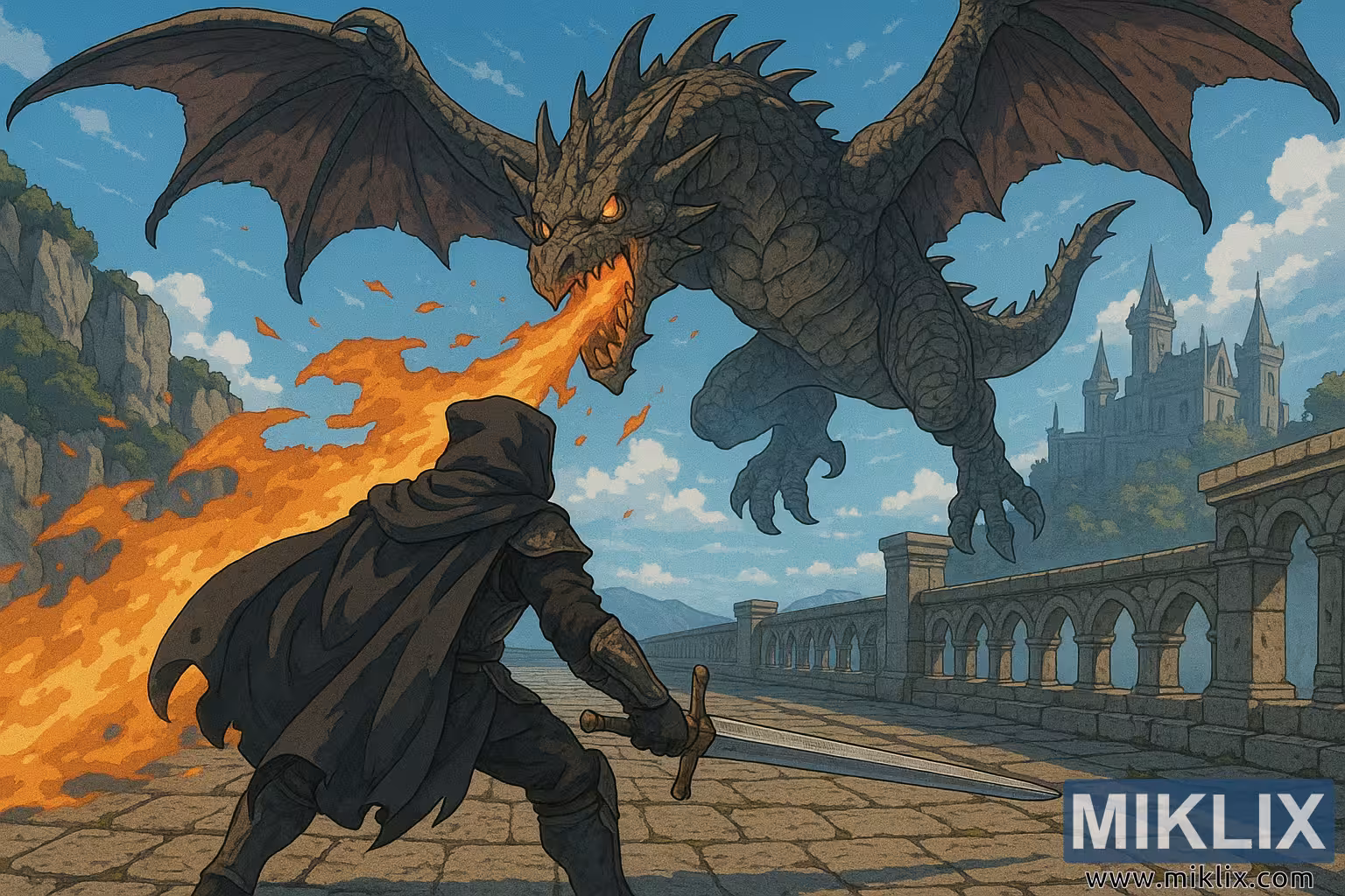 En general, la imagen transmite un momento congelado en el pico de tensión: Tarnished se mantiene firme ante la ira de un dragón, con una composición dinámica, colores vivos y un estilo de representación con influencia del anime que resalta el choque épico entre el héroe solitario y la bestia imponente.