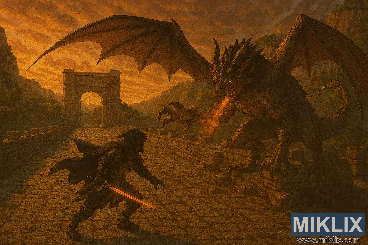 Esta pintura digital de alta resolución presenta una representación semirrealista del Deslustrado enfrentándose al Dragón Volador Greyll en el Gran Puente de Farum, en Elden Ring. La escena se presenta desde una perspectiva isométrica, lo que permite al espectador contemplar en toda su extensión el antiguo puente, los acantilados circundantes y el ardiente cielo del atardecer. La estilización tiende al realismo, con una anatomía definida, una iluminación tenue y texturas detalladas que evocan la atmósfera áspera de las Tierras Intermedias.