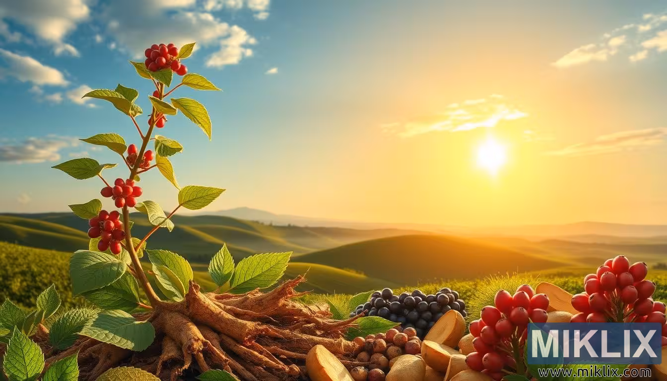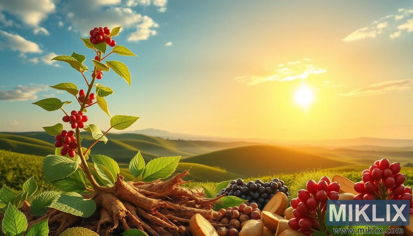 Ilustración vibrante de raíces, hojas y bayas de Ashwagandha con un paisaje tranquilo y luz solar dorada, que simboliza sus efectos calmantes y energizantes.
