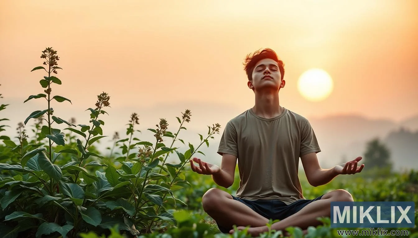 La imagen captura con belleza un momento de quietud e introspección, ofreciendo una representación simbólica de los beneficios para la salud mental asociados con la ashwagandha. En el centro, en primer plano, se encuentra un joven inmerso en meditación, con las piernas cruzadas en una postura clásica de yoga, las manos apoyadas suavemente sobre las rodillas y las palmas abiertas en un gesto de receptividad. Tiene los ojos cerrados, el rostro relajado y una postura firme, emanando una fuerza serena que sugiere equilibrio y paz interior. La simplicidad de su forma contrasta con la vitalidad del entorno natural que lo rodea, reforzando la armonía entre la presencia humana y las fuerzas curativas de la naturaleza. Su porte refleja un estado de serenidad que evoca las propiedades calmantes y antiestrés que la tradición ayurvédica atribuye a la ashwagandha.