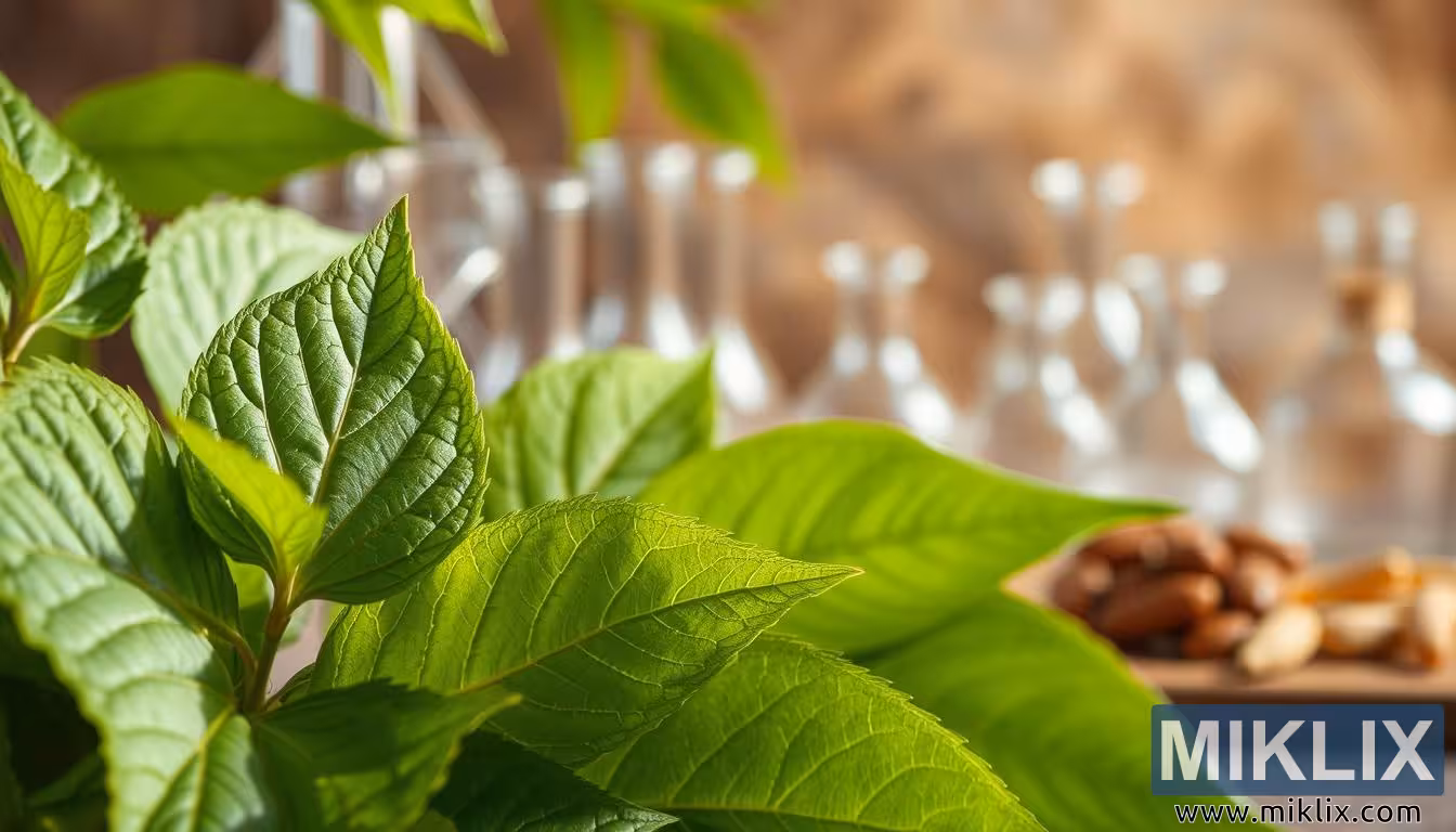 Imagen de alta resolución de hojas de ashwagandha con cristalería de laboratorio, que simboliza sus propiedades antiinflamatorias y la mezcla de ciencia tradicional y moderna.
