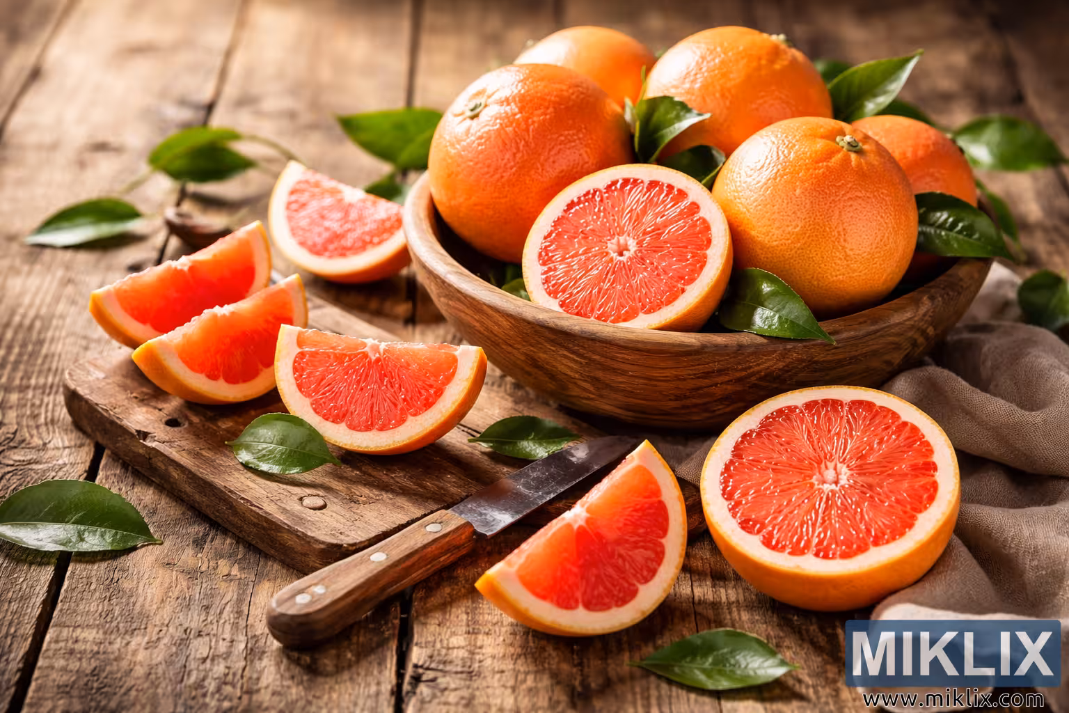 Una naturaleza muerta cálida y rústica que presenta pomelos maduros en un recipiente de madera con jugosas rodajas de color rojo rubí dispuestas sobre una mesa desgastada.