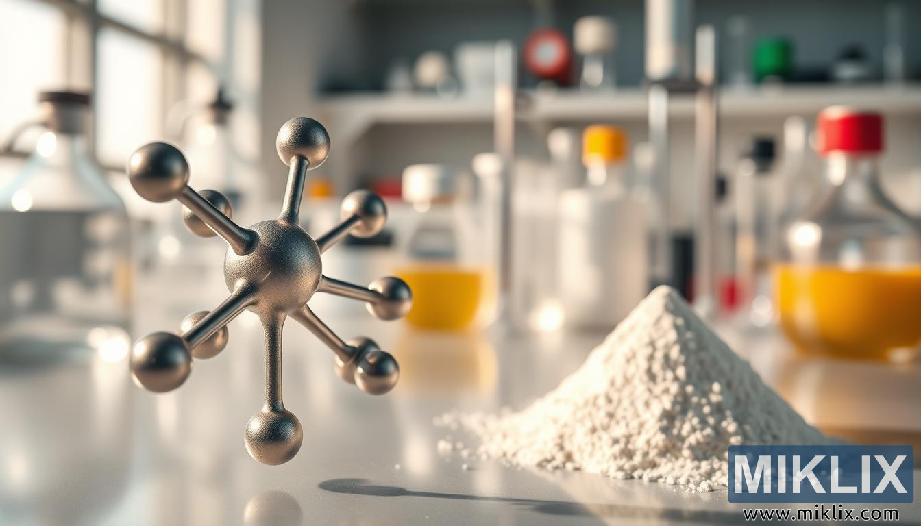 La iluminación cumple una doble función: realza el realismo y refuerza el mensaje simbólico de claridad y conocimiento. El brillo que incide sobre el modelo molecular y el polvo crea un punto focal, asegurando que la atención del espectador se centre en los componentes clave de la escena. Al mismo tiempo, la suave difusión de la luz en el espacio del laboratorio evita sombras intensas, sugiriendo transparencia e integridad, cualidades que resuenan profundamente en el contexto de la suplementación y la confianza del consumidor.