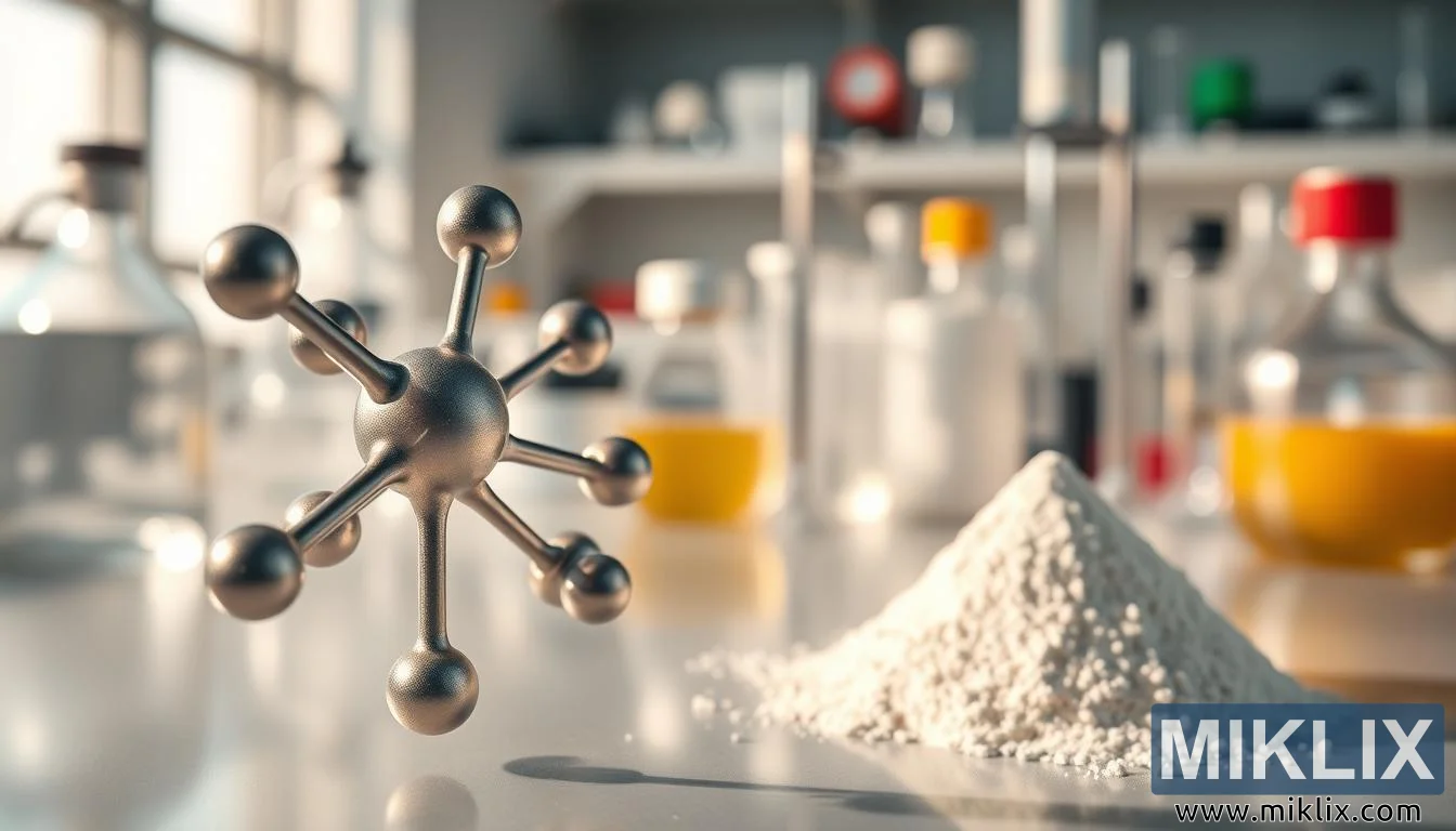 Simbólicamente, la composición subraya tanto el rigor científico como la accesibilidad de los suplementos dietéticos. El modelo molecular sugiere la importancia de comprender el compuesto a nivel químico, mientras que el polvo representa su traducción a una forma utilizable para los consumidores. El trasfondo de laboratorio refuerza la credibilidad de este proceso, evocando temas de seguridad, pruebas y precisión. Juntos, estos elementos tejen una narrativa que destaca la L-Carnitina L-Tartrato no solo como un producto para el bienestar, sino como el resultado de la investigación científica, el perfeccionamiento tecnológico y el compromiso con la optimización de la salud.