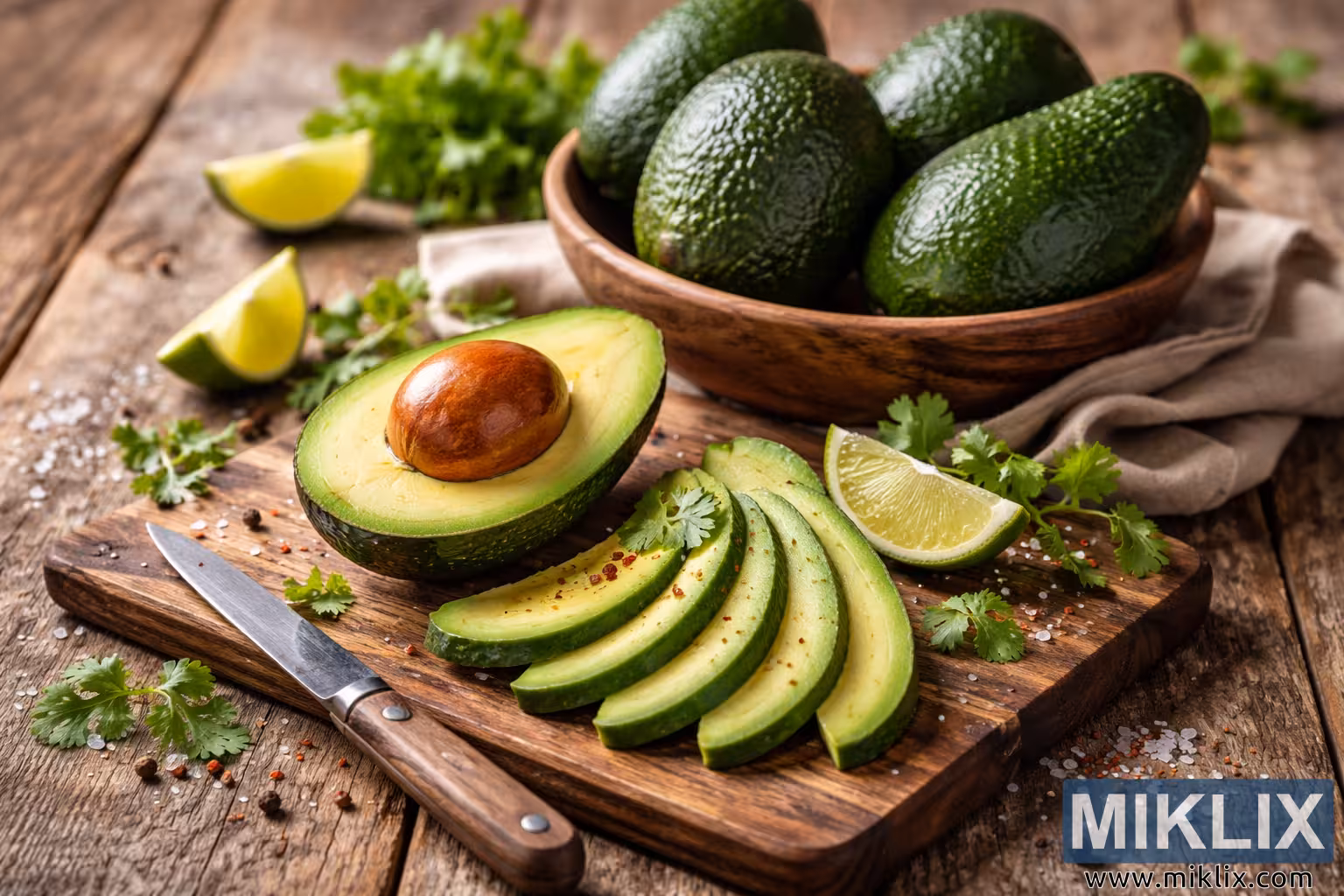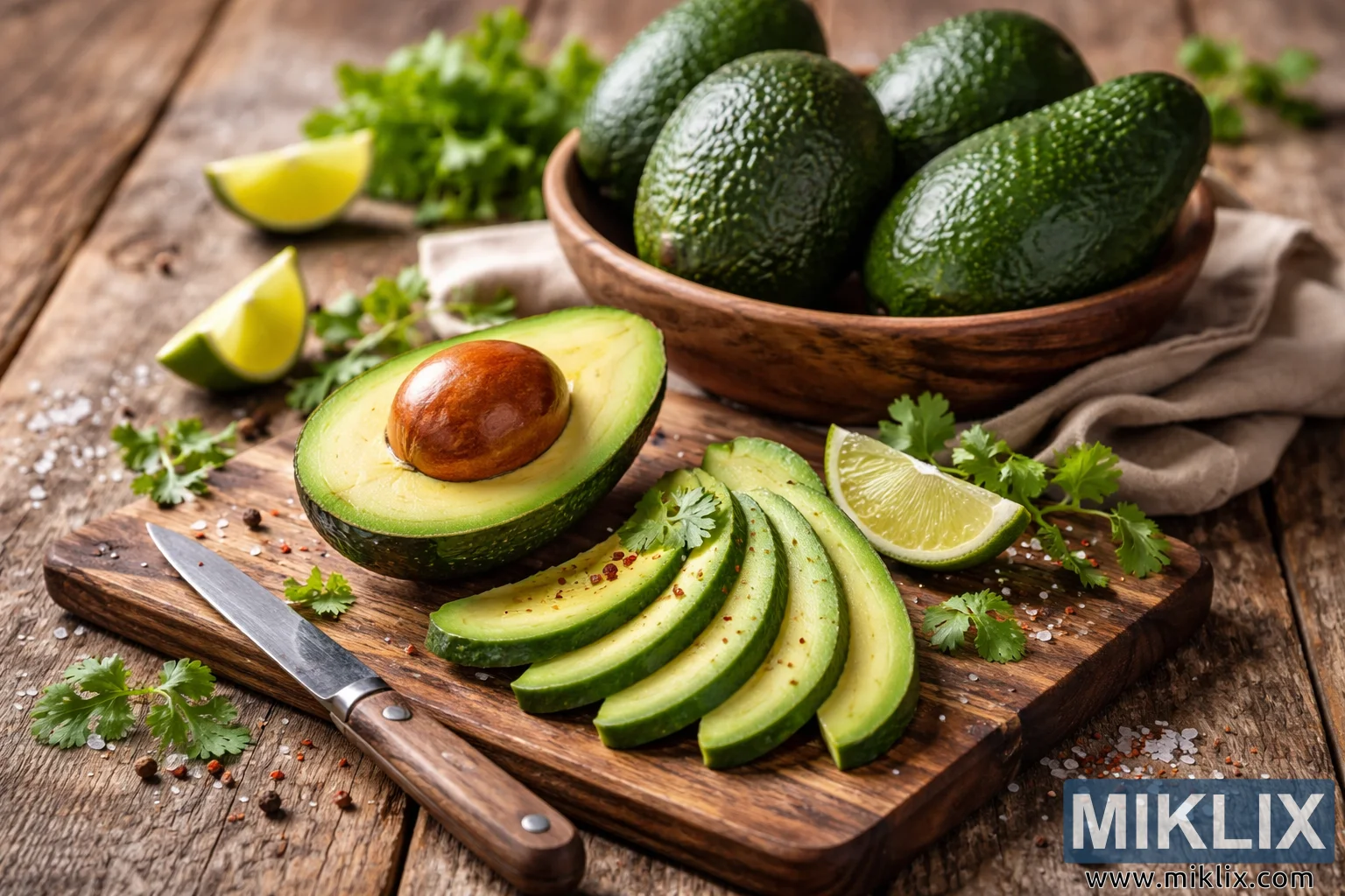 Fotografía de alta resolución de aguacates maduros bellamente dispuestos en una mesa de madera rústica con gajos de lima, cilantro, sal marina y hojuelas de chile, evocando una cocina casera fresca.