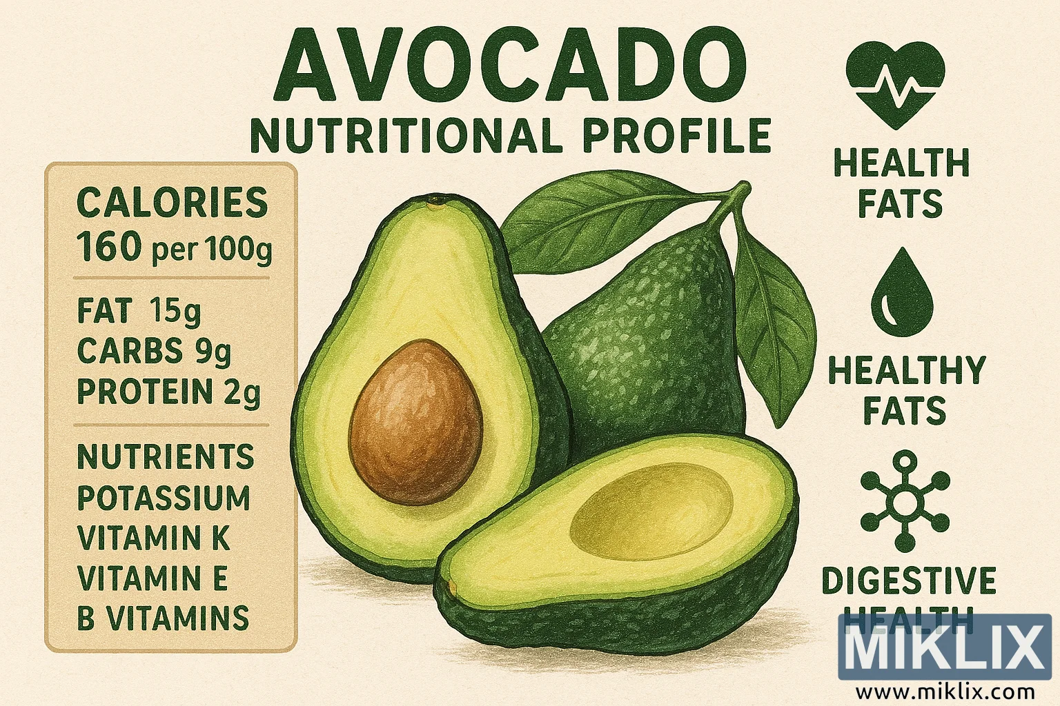 Una infografía educativa, limpia y moderna, en formato horizontal, explica visualmente el perfil nutricional y los beneficios para la salud del consumo de aguacate. El fondo, de un blanco roto claro y ligeramente texturizado, crea la sensación de un papel de alta calidad, realzando los tonos verdes del aguacate. En el centro de la composición, dos grandes mitades de aguacate se ilustran en un estilo digital semirealista, dibujado a mano. Una mitad muestra la pulpa cremosa de color verde pálido con suaves degradados, mientras que la otra muestra claramente la gran semilla marrón. Alrededor del fruto, unas hojas de color verde intenso con venas visibles aportan un marco fresco y natural, enfatizando la idea de un alimento integral y sin procesar.