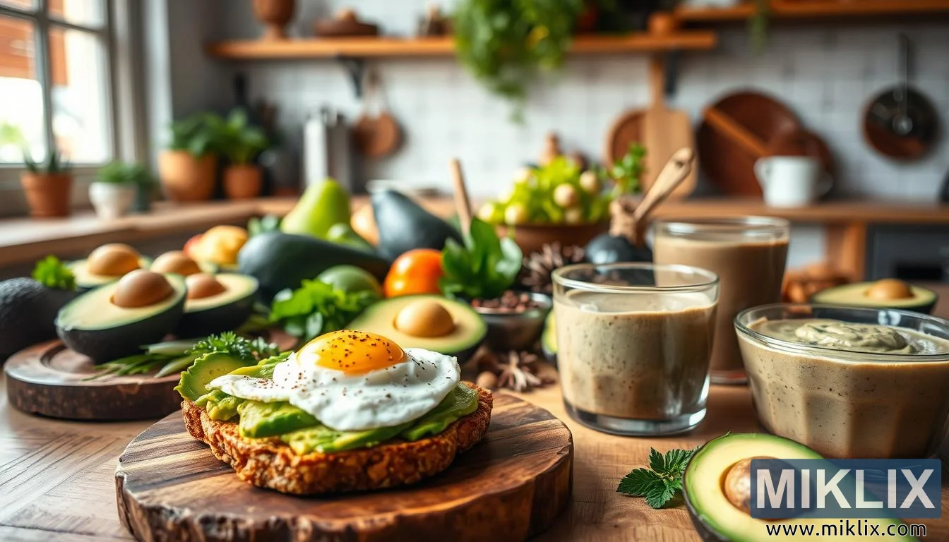 En conjunto, la imagen transmite más que el simple atractivo de los platos a base de aguacate; narra una historia de salud, bienestar e inspiración culinaria. La tostada de aguacate con su huevo líquido evoca la belleza de las comidas sencillas y equilibradas, mientras que la mousse y los batidos revelan la versatilidad de la fruta, capaz de abarcar desde lo salado hasta lo dulce, desde el desayuno hasta el postre. La composición general se siente como una invitación, no solo a saborear el aguacate, sino a abrazar el estilo de vida que simboliza: una vida sana, una alimentación consciente y la alegría de crear platos que nutren tanto el cuerpo como el alma. Es un retrato de la comida no solo como sustento, sino también como arte, como tradición y como una celebración de la abundancia cotidiana.