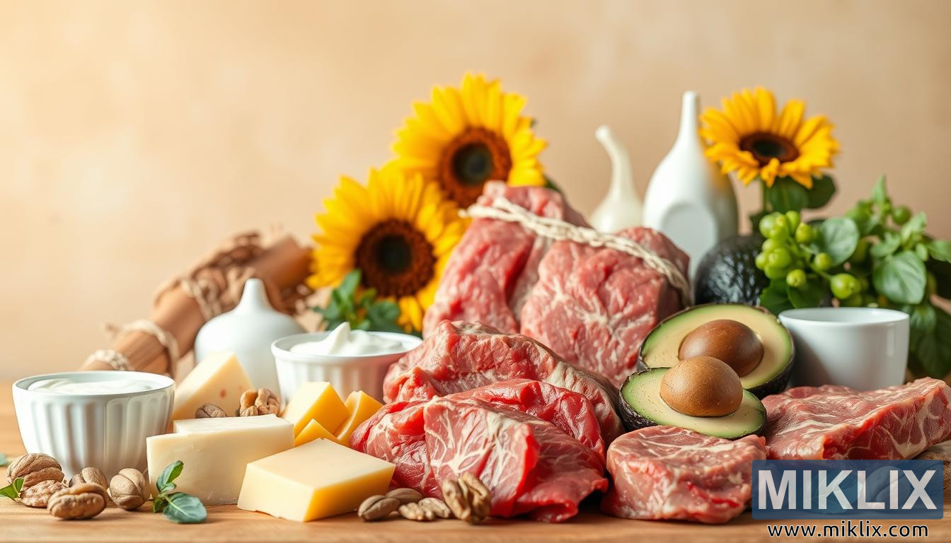 Una vibrante naturaleza muerta de alimentos ricos en CLA, como carne de res, cordero, queso, yogur, nueces, semillas y aguacates, capturados con una luz cálida y natural para una vista apetitosa.