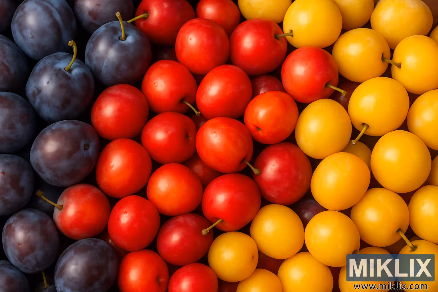 Pilt on detailne ja kõrge eraldusvõimega foto, mis jäädvustab koduaiast pärit erksavärvilist küpsete ploomide sortimenti, mis on kaunilt seatud esile, et näidata nende mitmekesisust värvi, kuju ja tekstuuri osas. Kompositsioon ulatub üle kaadri tasakaalustatud maastiku orientatsioonis, moodustades visuaalselt silmatorkava toonigradiendi, mis läheb sujuvalt üle vasakul asuvatest sügavlilladest läbi keskel asuvate erksate punaste ja paremal asuvate säravate kollaste toonideni. Iga ploomikobar on tihedalt pakitud, täites kaadri täielikult ilma nähtava taustata, luues haarava ja küllusliku mulje.