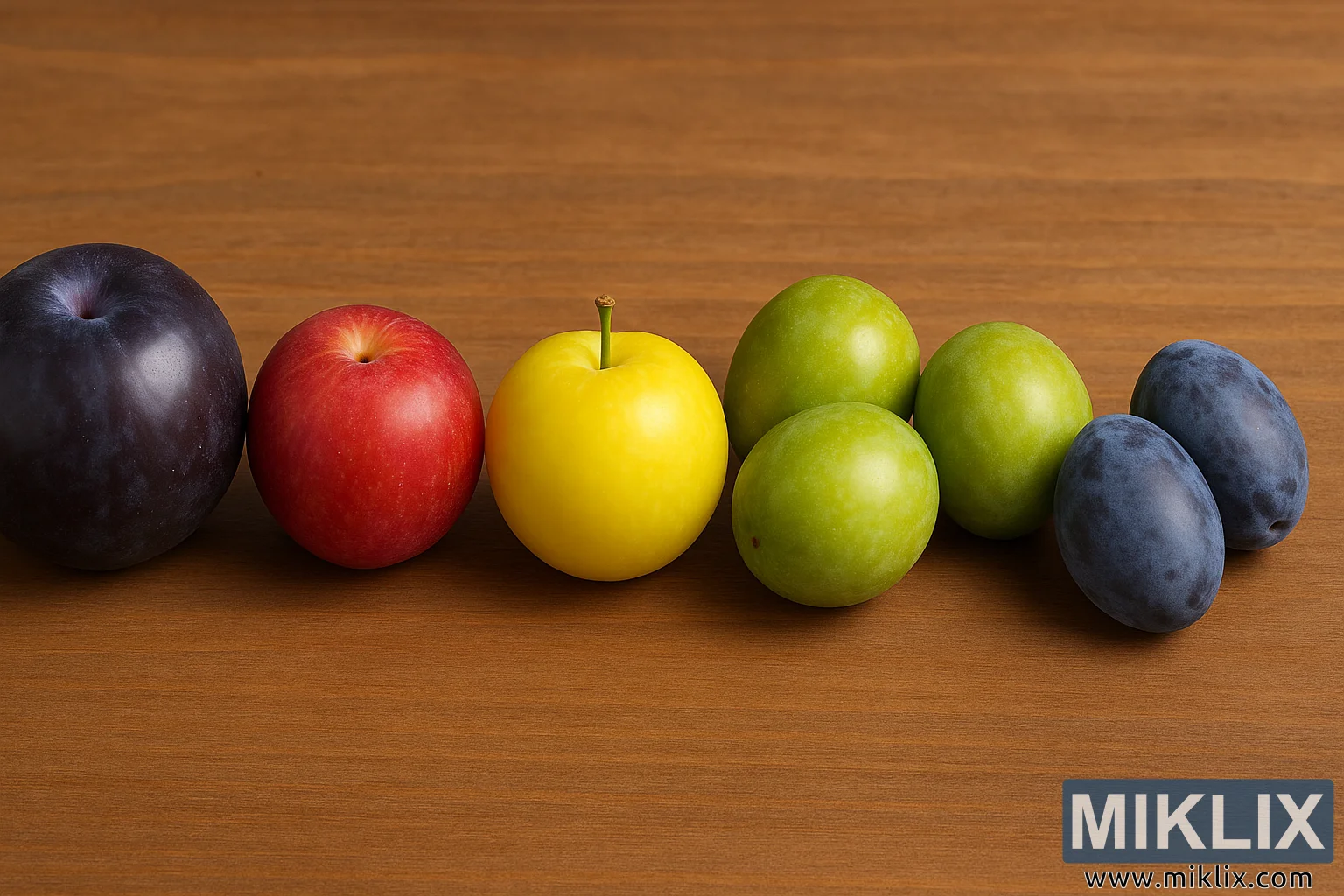 Pilt on kõrgresolutsiooniga maastikufoto, mis kujutab seitsme erineva ploomisordi visuaalselt silmatorkavat rivi, mis on korralikult asetatud siledale soojatoonilisele puitpinnale. Kompositsioon toob esile nende laia värvi- ja suurusvaliku ilma siltide või tekstita, lastes viljadel endil kesksel kohal olla. Valgustus on pehme ja ühtlane, luues iga ploomi alla õrnad varjud ja peened peegeldused, mis rõhutavad nende loomulikku tekstuuri.