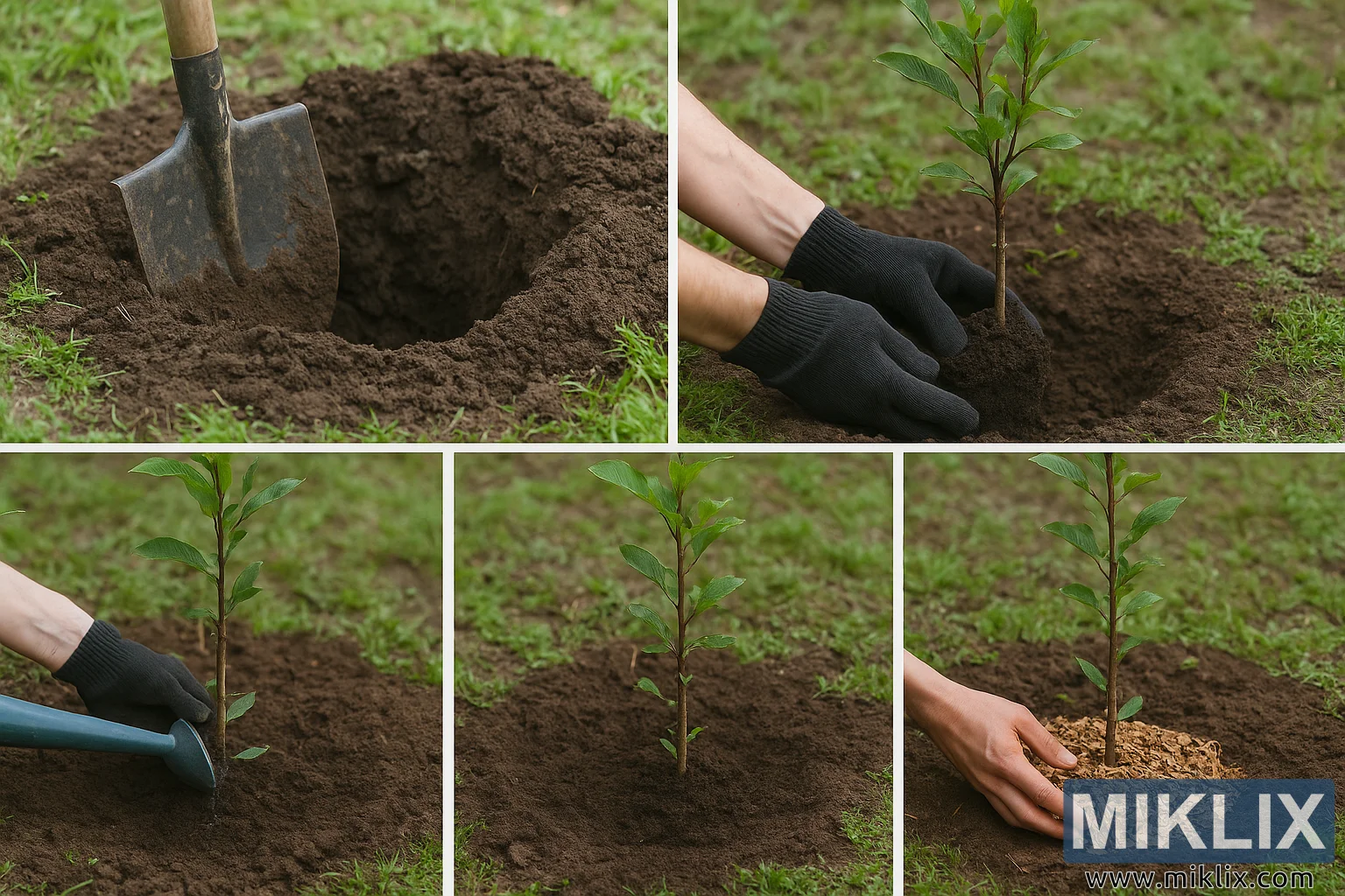 Kõrgresolutsiooniline kollaaž, mis näitab noore ploomipuu istutamise viit sammu: kaevamine, asetamine, kastmine, vaatlemine ja multšimine.