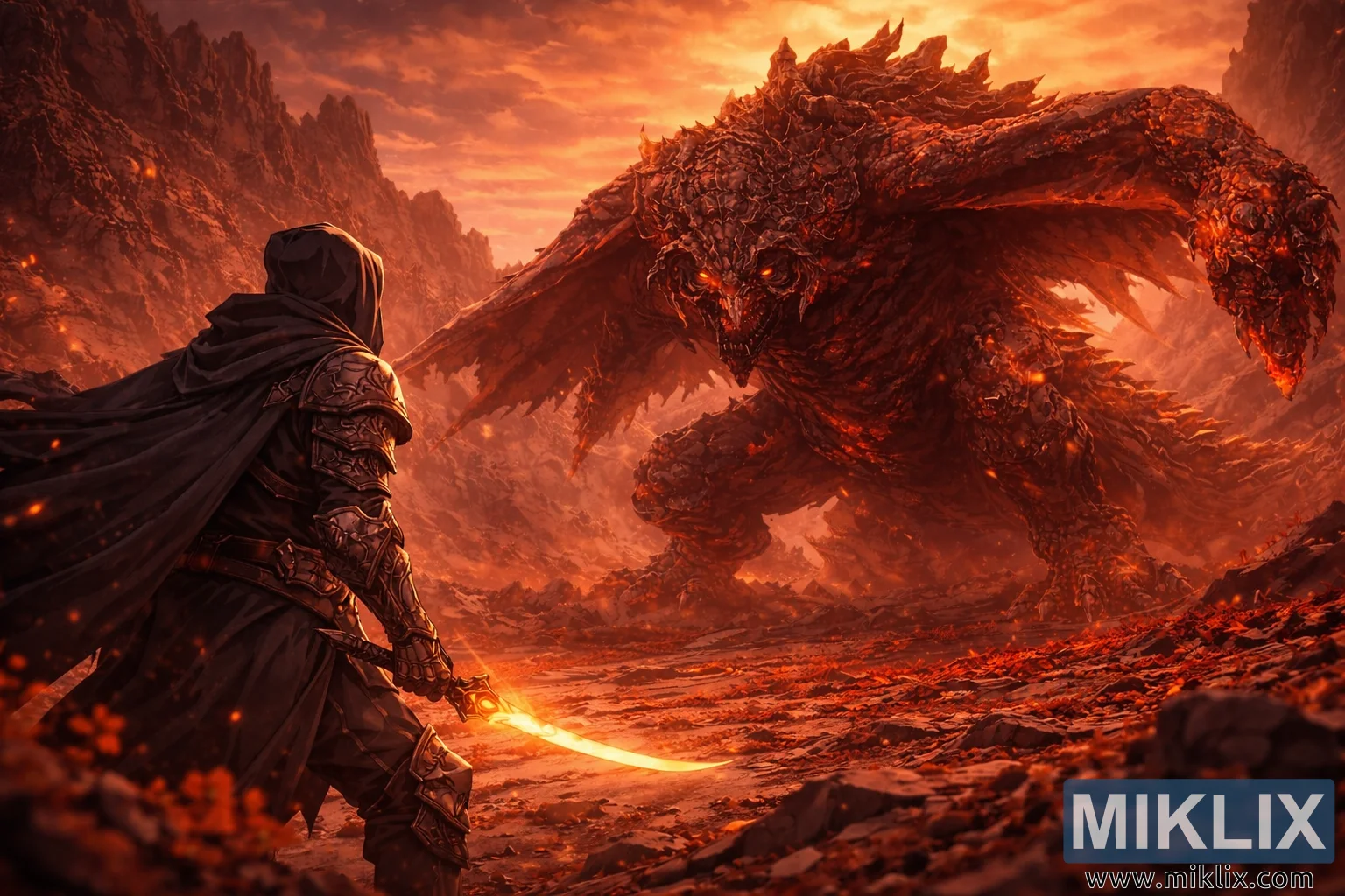 Pilt kujutab eepilist anime-stiilis fännikunsti stseeni, mis toimub *Elden Ring: Shadow of the Erdtree* kõrbenud Jagged Peaki kõrgustikel, jäädvustades laetud vaikust vahetult enne lahingu algust. Kaamera on paigutatud Tarnished'idest veidi taga ja paremal, asetades nad kaadri vasakule küljele ja rõhutades nende perspektiivi ülekaaluka vaenlase ees. Osaliselt tagantpoolt vaadatuna tunduvad Tarnished'id avaras keskkonnas väikesed, rõhutades hetke iseloomustavat isolatsiooni ja otsusekindlust. Nende Musta Nuga soomus on renderdatud sügavates varjutatud toonides, kihiliste plaatide ja voolava keepiga, mis lookleb nende taga. Soomuse servi jälgivad peened esiletõstmised, mis püüavad kinni lahinguväljalt tuleva tulevalguse. Nende paremas käes, madalal, kuid valmis, on kumer tera, mis hõõgub sulaoranži läikega, selle valgus peegeldub nõrgalt pragunenud maapinnal.