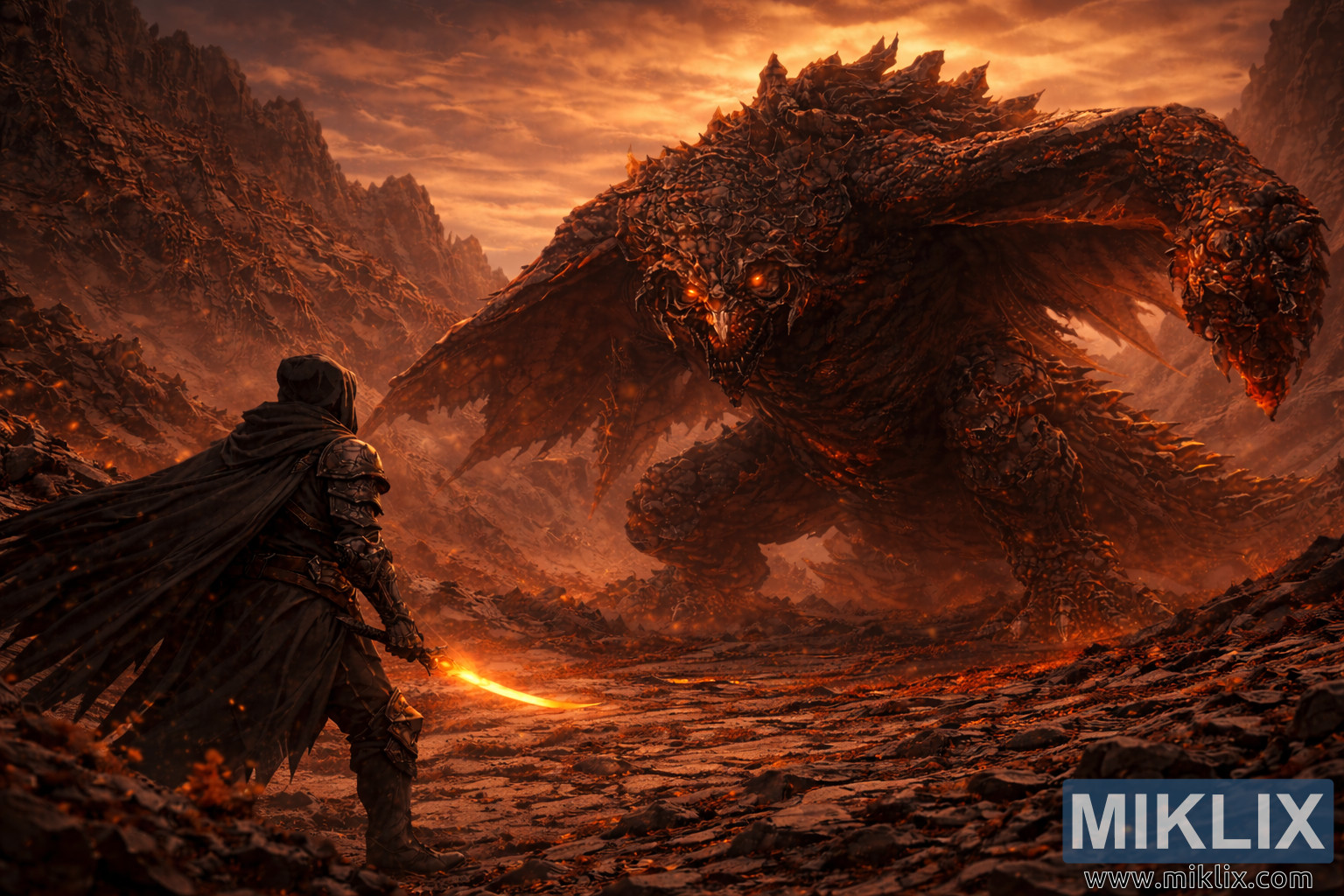 Tume ja realistlik Elden Ring: Shadow of the Erdtree fännikunst, mis kujutab Tarnishedit vastamisi kolossaalse Bayle the Dreadiga Jagged Peaki vulkaaniliste kaljude ja sütega täidetud taeva keskel.