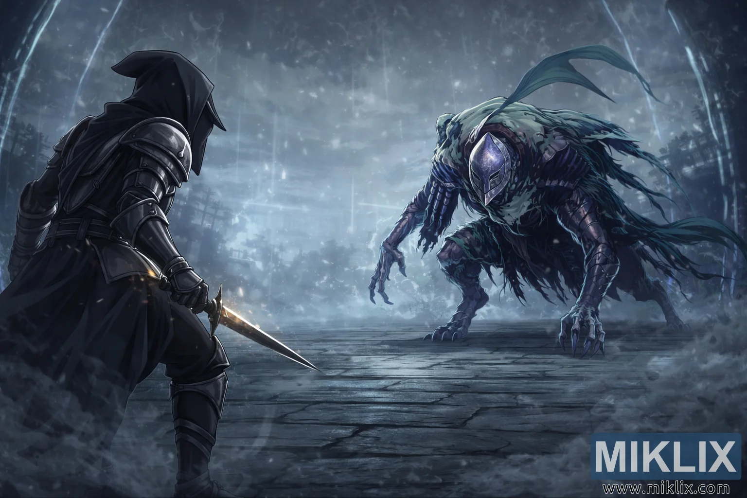 Animest inspireeritud Elden Ringi fännikunst, mis kujutab mustas noasoomusrüüs Tarnished Man's Rights'i ja Verekoera rüütli Darriwili kohtumist Forlorn Hound Evergaoli vanglas hetki enne lahingut.