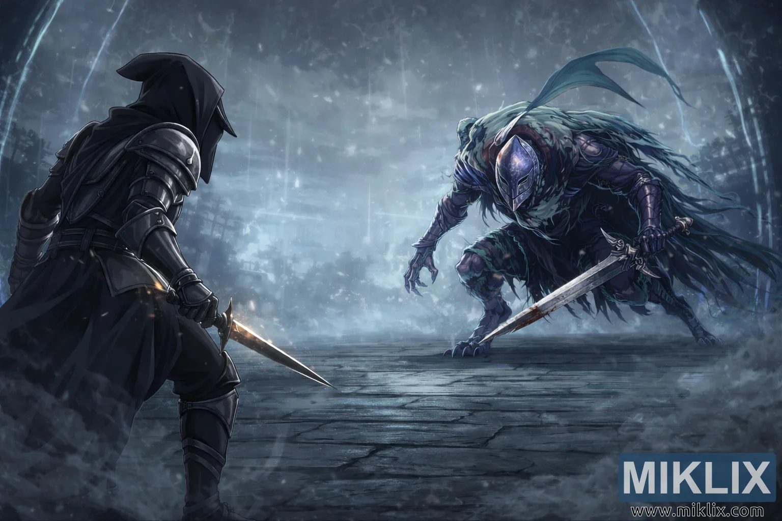 Animest inspireeritud Elden Ringi fännikunst, mis kujutab Tarnishedit hetked enne lahingut Forlorn Hound Evergaolis vastamisi mõõgaga vedava Verekoera Rüütli Darriwiliga.