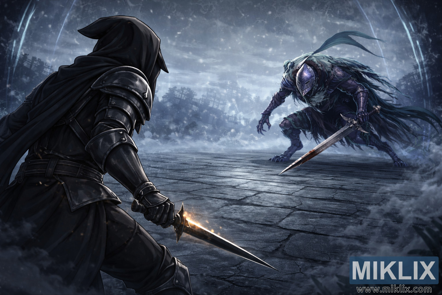 Animest inspireeritud Elden Ringi fännikunst, mis kujutab üle õla vaadet Tarnishedist, kes seisab silmitsi mõõgaga vedruga Verekoera rüütel Darriwiliga Forlorn Hound Evergaolis.