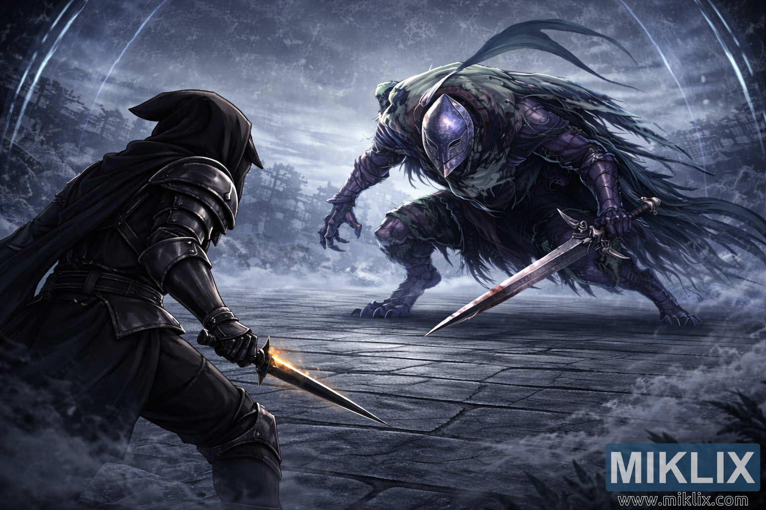 Dramaatiline lainurk-anime-stiilis fantaasiaillustratsioon jäädvustab pingelise ootusärevuse hetke kummituslikus vanglaareenis, mida tuntakse nime all Forlorn Hound Evergaol. Stseen on ümbritsetud tohutu poolläbipaistva sätendava maagilise energia kupliga, mis kaardub kõrgel pea kohal nagu taevane kest, selle pind väreleb nõrkade valgusvoogudega, justkui liiguksid nähtamatud lained läbi klaasi. Jahe sinakas valgustus levib üle keskkonna, segunedes triiviva uduga, mis lookleb mööda pragunenud kivipõrandat. Pisikesed hõõguvad osakesed hõljuvad õhus nagu kauged söed või tähetolm, andes areenile ebamaise, ajas hõljuva atmosfääri, mis suurendab eelseisva kokkupõrke pinget.