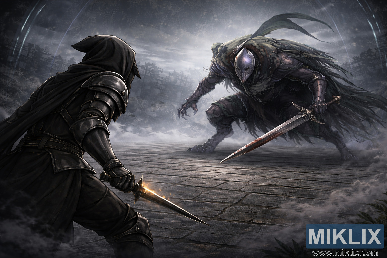 Elden Ringist inspireeritud digitaalne tumefantaasiamaal, mis kujutab Tuhmunud ja Verekoera rüütel Darriwili enne lahingut Surmava Koera Evergaoli sees.