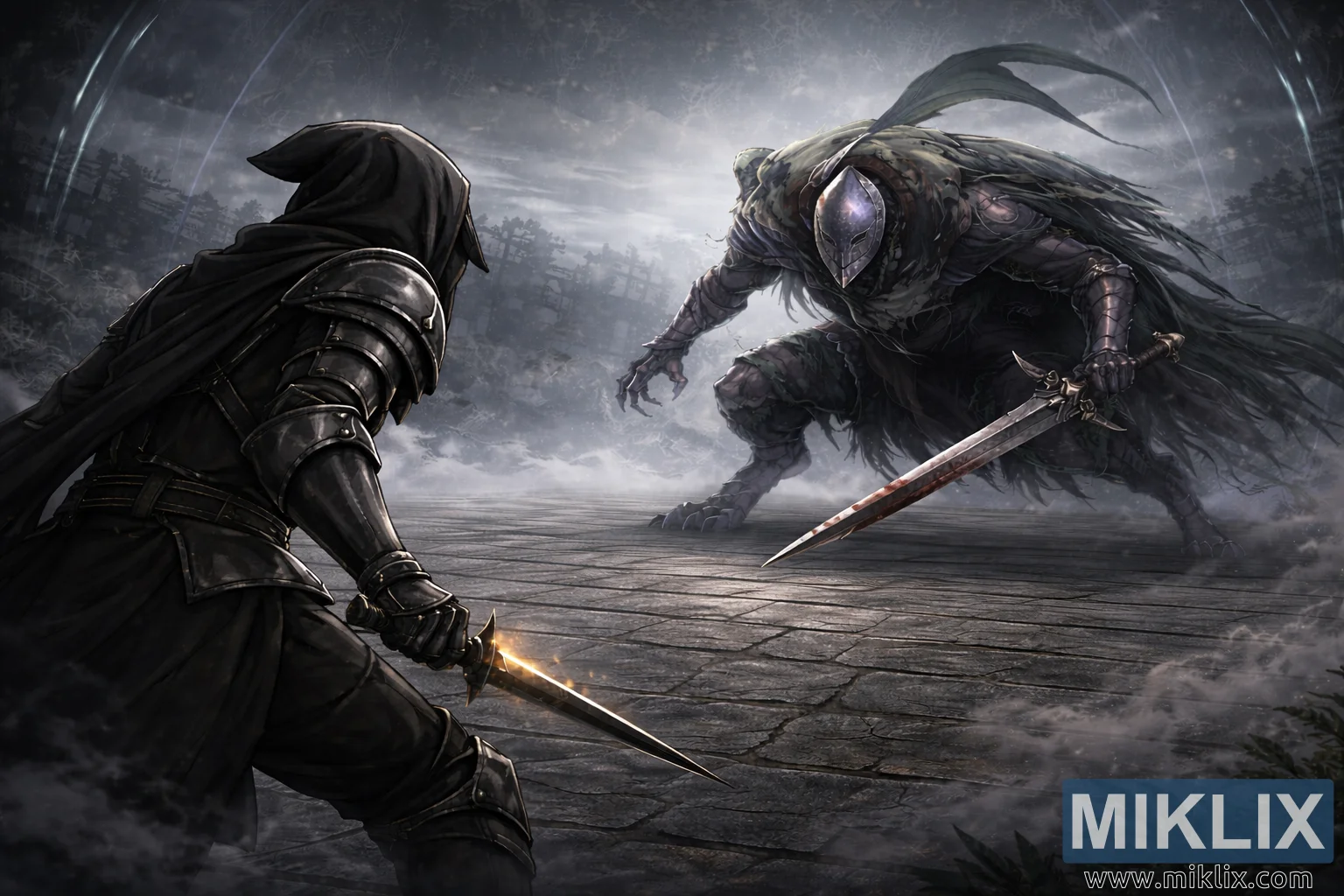 Tuhmunud vastas, paremal pool keskväljakut domineerides, küürutab Verekoerte Rüütel Darriwil, märgatavalt suurema mastaabiga ja lähemal kui varasematel hetkedel, suurendades ohtu. Rüütli rüht on madal ja loomalik, piklikud jäsemed laiali sirutatud ja küünistega sõrmed suruvad kivisse, justkui oleks ta valmis ette sööstma. Soomus näib ilmastikukindel ja lahinguarmistunud, kihiline rebenenud riidest ja karusnahast tekstuuridest, mis voolavad figuuri taha, jäädvustades seda pigem maalilise realismi kui teravate animejoontega. Ühes käes hoiab rüütel pikka, sakilist mõõka, mis on diagonaalselt allapoole suunatud, selle tera peegeldab kahvatuid peegeldusi ja nõrku tumedaid plekke, mis viitavad varasematele konfliktidele ilma graafiliste detailideta. Kiivri kitsas visiir kiirgab tuhmi violetset kuma, pakkudes häirivat fookuspunkti, mis on kontrastiks summutatud loomuliku valgusega ja annab figuurile ebainimliku kohaloleku. Udukilbid ümbritsevad tera ja jalgu, sulatades rüütli kummituslikku keskkonda, säilitades samal ajal võimsa silueti.