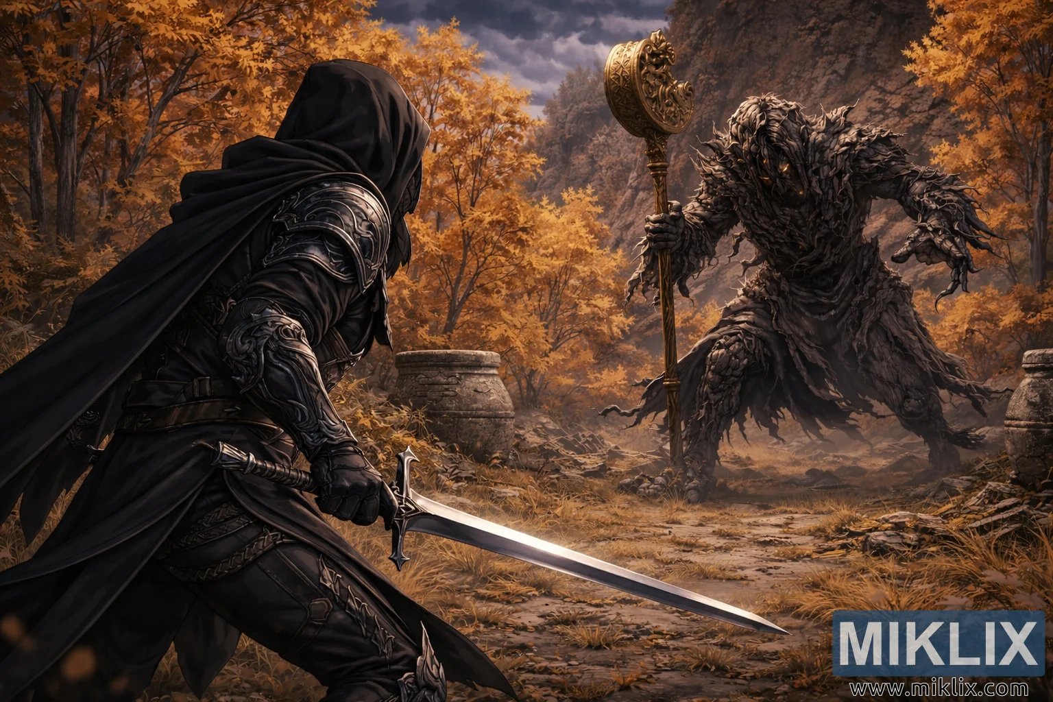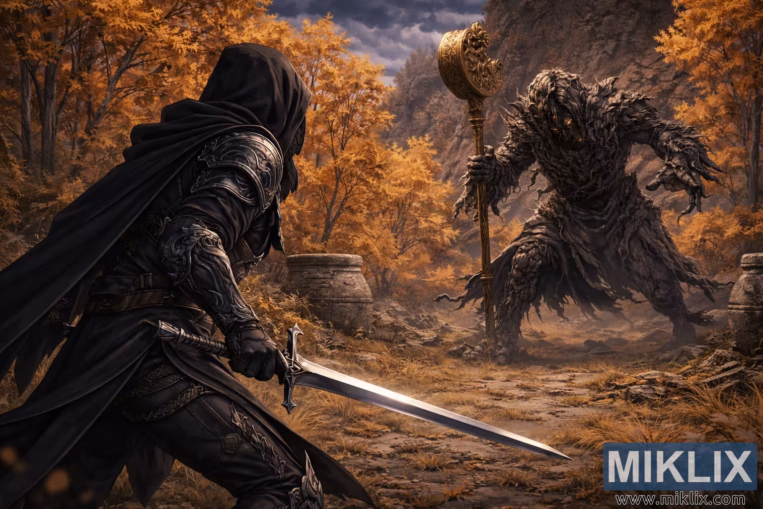 Pea kohal heidab raske, pilvedega kaetud taevas lagendikule hajutatud jahedatoonilise valguse. Varjud kogunevad soomusplaatide alla, keepi voltidesse ning Avatari juurte ja koore vahele, samal ajal kui peent esiletõstmine jälgib mõõga tera ja kuldset relva. Üldine kompositsioon külmutab vägivallale eelneva vaikusehetke, tabades Elden Ringi melanhoolse, müütilise atmosfääri, kus iga vastasseis tundub tahtlik, rituaalne ja saatusega laetud.