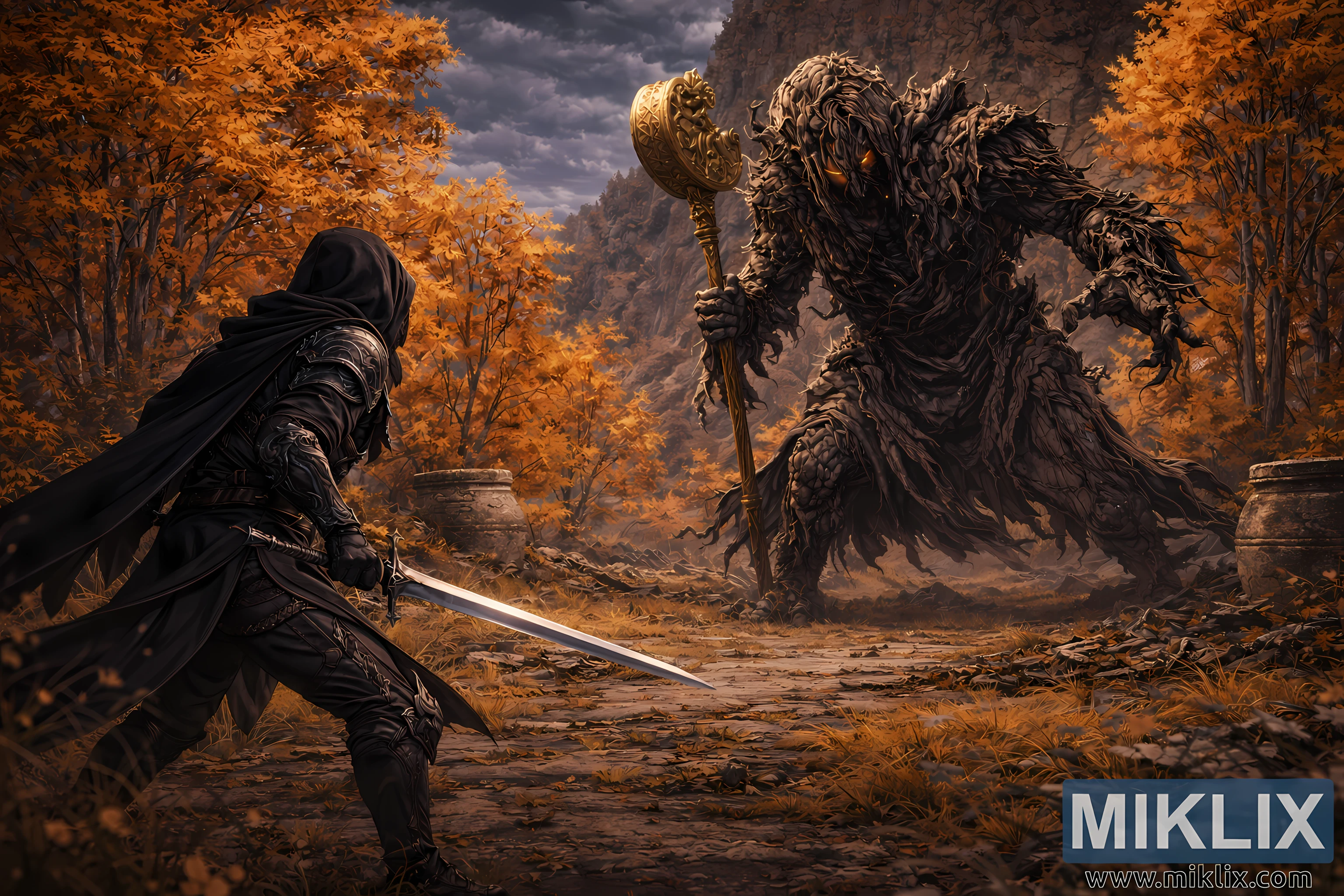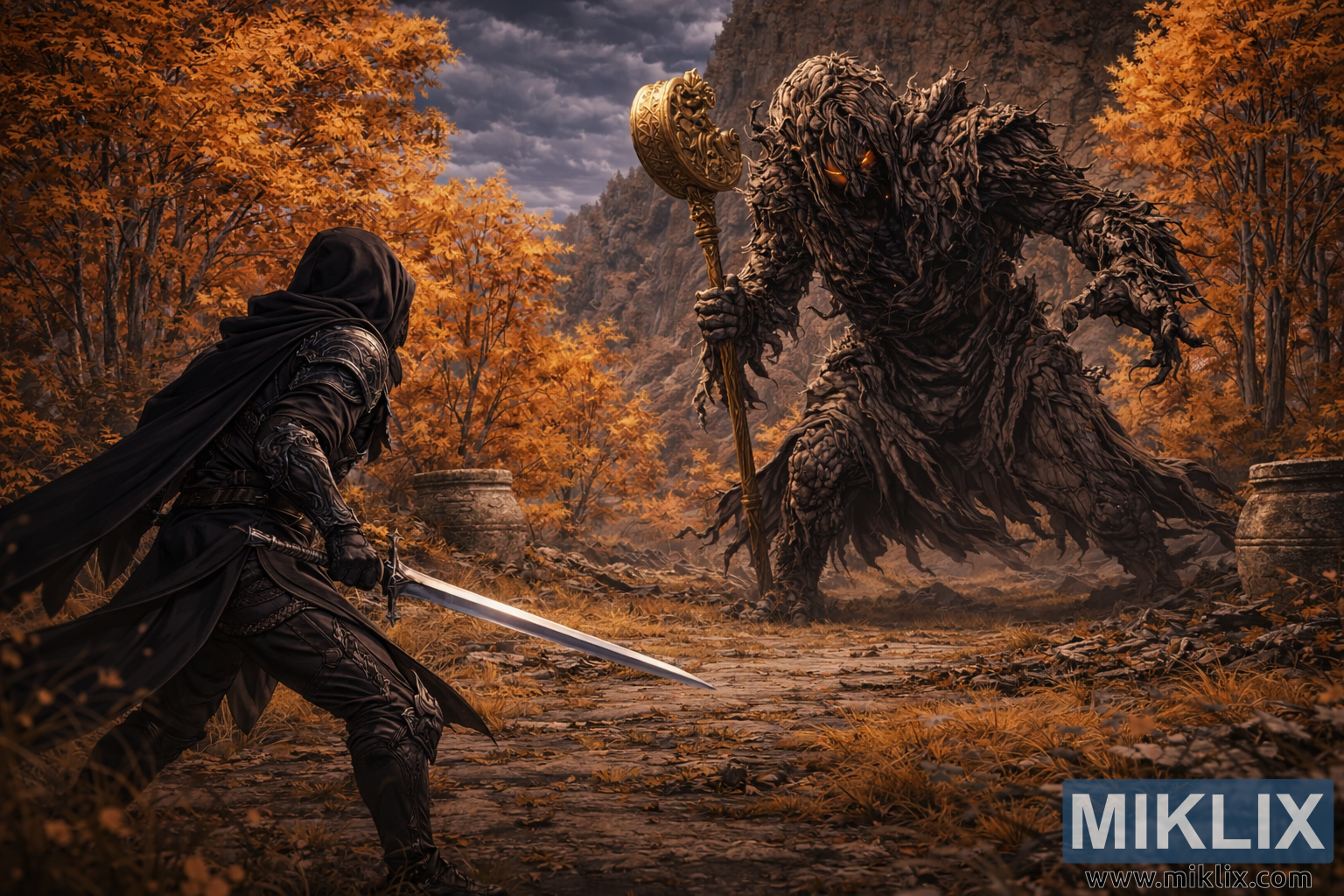 Keskkond on Kirde-Liurnia Järvede all sügisperioodil, rikkaliku detailirohke pildiga. Võitlejate vaheline maapind on ebatasane ja kaetud langenud lehtede, kuiva rohu ja lagunevate kivivaremete fragmendiga, mis on kunagise püha paiga jäänused, mille loodus on aeglaselt tagasi vallutanud. Lagenikku täpistavad purunenud sambad ja madalad kiviehitised, mis on osaliselt mattunud maa ja lehestiku alla. Ümbritsevad puud säravad tihedates sügisvärvides – kuldses, merevaigus ja roostes – moodustades vastasseisu ümber elava raami. Erdtree avatari taga kõrguvad järsud kaljud kaugusesse, lisades sügavust ja rõhutades veelgi selle kõrguvat ulatust.