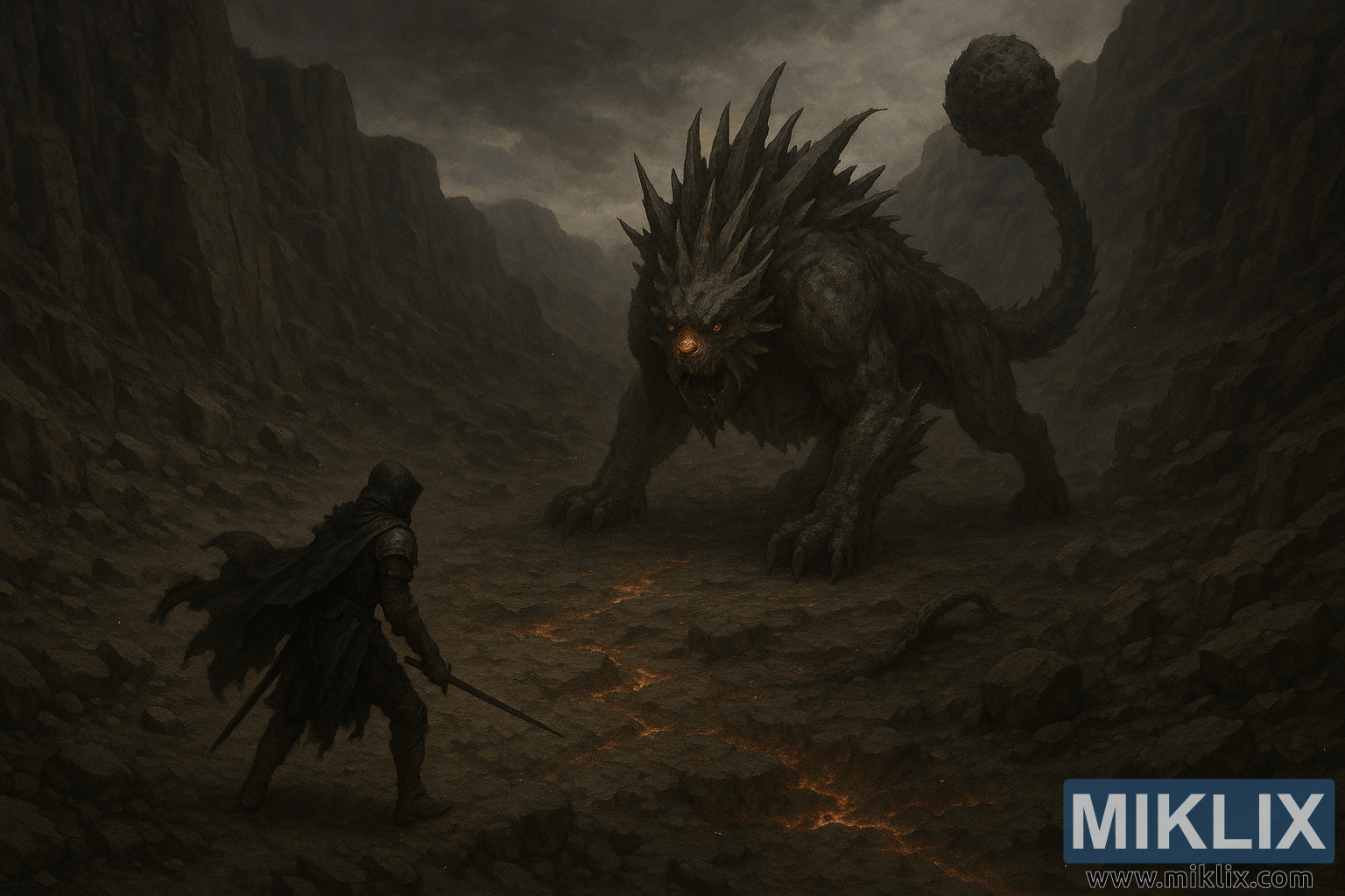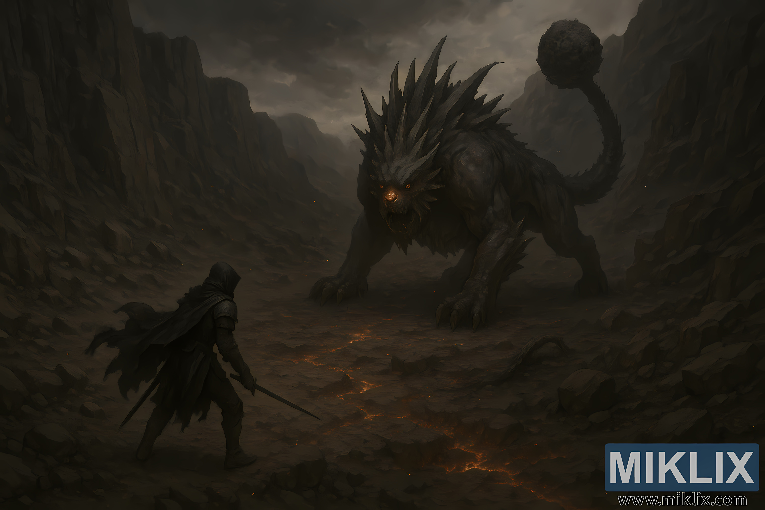 Koletise tohutu segmenteeritud saba kaardub dramaatiliselt ülespoole, lõppedes ikoonilise sfäärilise sulanud kivimassiga. Ülevalt vaadates meenutab see kuju lööki ootavat meteoori, lisades visuaalset raskust, mis rõhutab olendi ähvardavat siluetti. Laava lõhed mõlema võitleja all pulseerivad rütmilises valguses, luues tuliste esiletõstmiste raja, mis loomulikult suunab vaataja pilgu sõdalase ja koletise vahel.