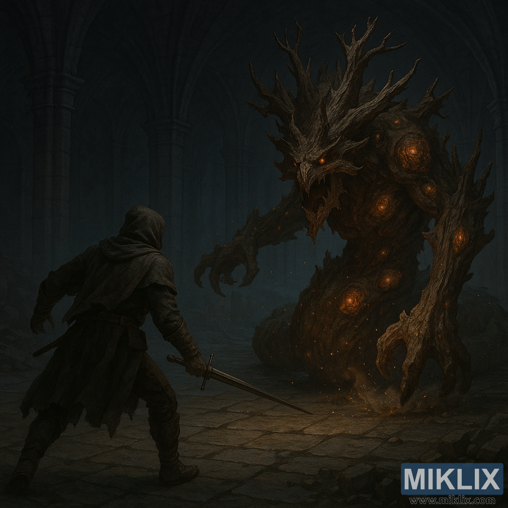 Realistlik tume fantaasiakunst tuhmunud meenutavast sõdalasest, kes seisab silmitsi tohutu haavanditest vaevatud puukoletisega iidsetes katakombides, mis hõõguvad oranži seenmädaniku käes.