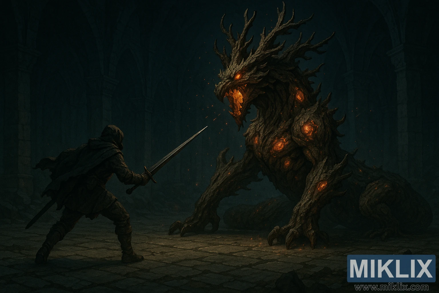 Realistlik tume fantaasiakunst tuhmunud meenutavast sõdalasest, kes on keset lahingupositsiooni ja seisab iidses maa-aluses katakombis silmitsi kolossaalse, haavanditest vaevatud puuolendiga.