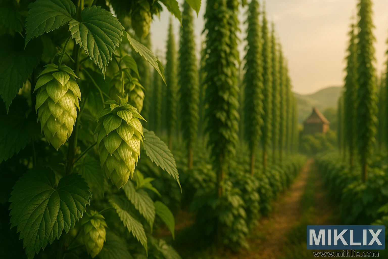 Keskmaale liikudes ulatuvad vertikaalselt mööda ühtlaselt asetsevaid trelle või poste read robustseid ronivaid humalakapsleid. Iga kapsas on jäme ja lihaseline, keerdudes päikese poole sirutudes päripäeva – see on Humulus lupulus liigi ikooniline tunnus. Kappide ühtlus ja kõrgus loovad visuaalselt silmatorkava, katedraalilaadse rohelise tunneli, mida rõhutab lehestiku kaudu filtreeruv valguse ja varjude mäng. Valgus on suunatud, kuid pehme, tõenäoliselt madalalt laskuvalt päikeselt, mis on just alustanud oma laskumist, andes kogu stseenile romantilise kuma.