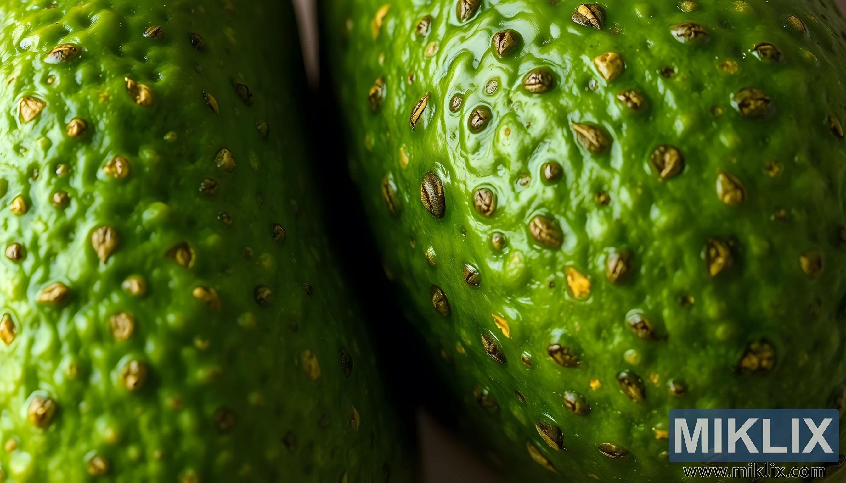 Pilt pakub erakordset lähivõtet avokaado koorest, suurendades selle keerukat pinda viisil, mis muudab selle igapäevase puuvilja peaaegu teispoolsuseks. Kaader on täis rikkalikke, rohelisi toone, iga toon sulandub sujuvalt järgmisesse, luues orgaanilise tekstuuriga elava lõuendi. Koor, mis pole kaugeltki sile, on kaetud väikeste, kivikesetaoliste eendite ja pisikeste servadega, mis tõusevad ja langevad nagu miniatuursed künkad, jättes mulje lopsakast, võõrast maastikust. Need peened, kuid keerulised mustrid pole mitte ainult visuaalsed detailid, vaid ka kombatavad kutsed, mis vihjavad koorealusele tugevusele ja kreemjale viljalihale, mis asub otse selle all. Pehme, loomulik valgus libiseb üle pinna, tabades kõrgendatud alasid ja heites soontesse nõrku varje, andes kompositsioonile sügavust ja dimensioonilisust.