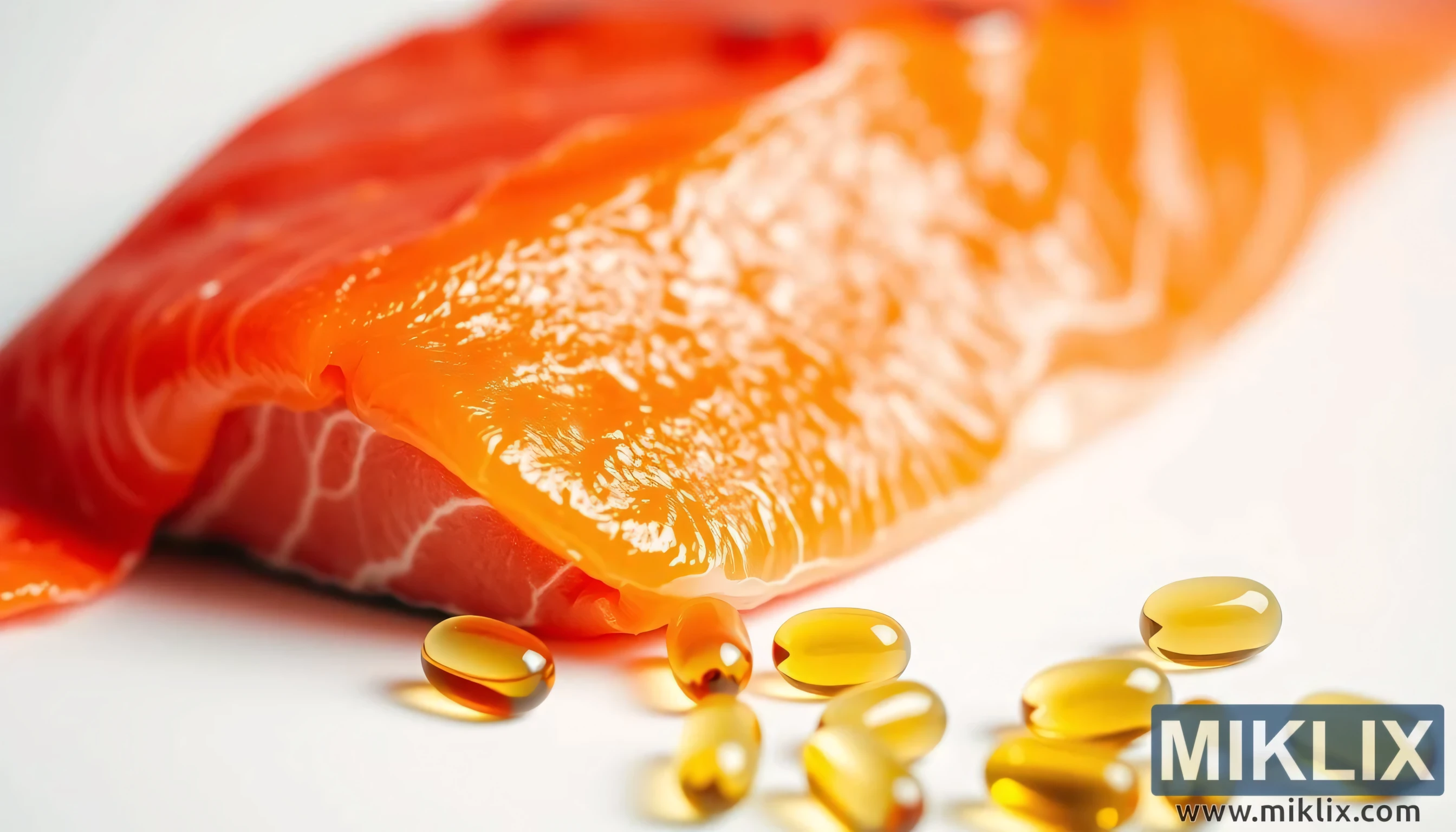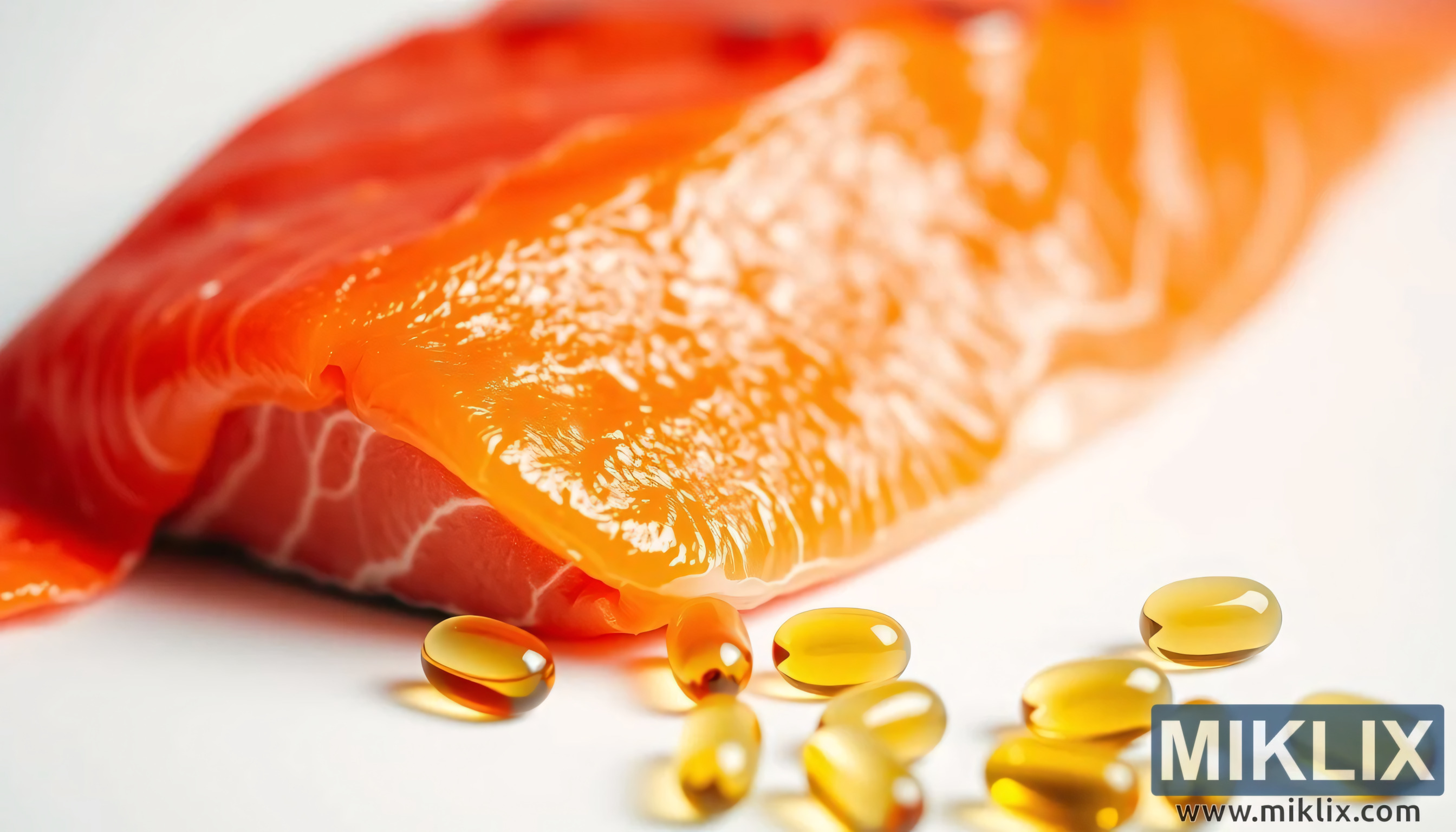 Lähivõte lõhefileest kalaõlikapslitega valgel taustal, mis toob esile oomega-3-rasvhapped ja südametervisele kasulikud omadused.