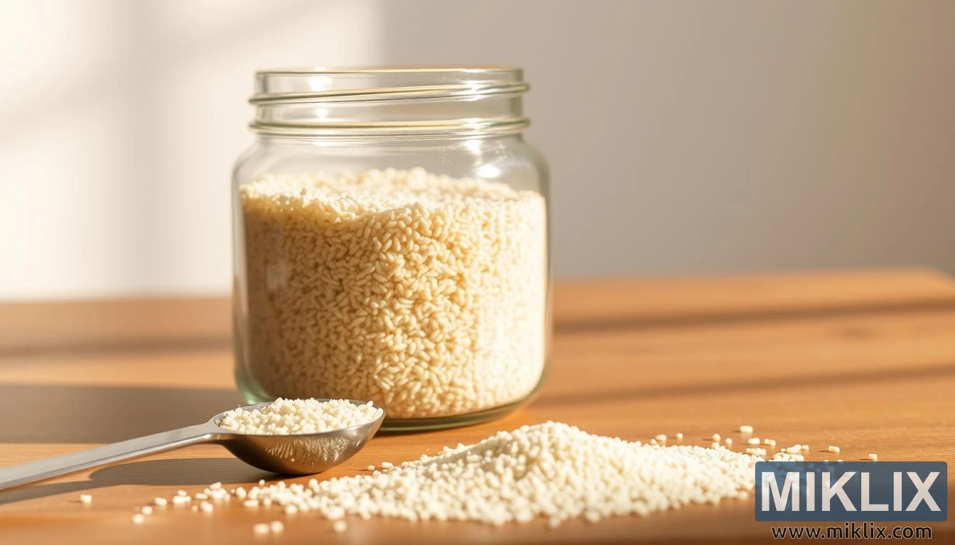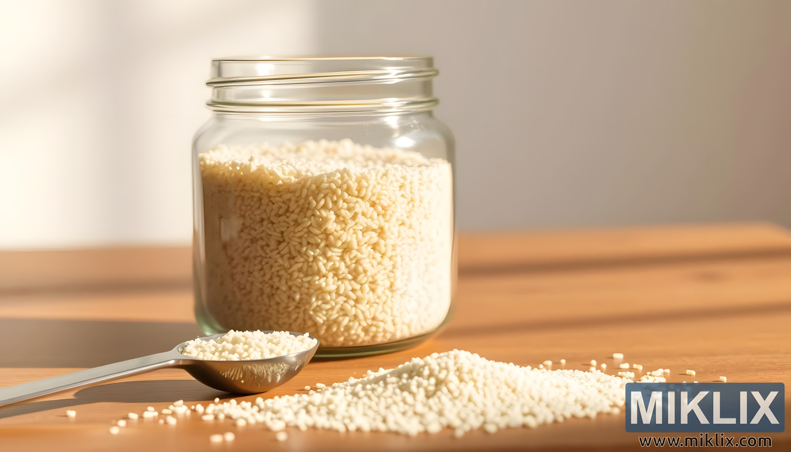 Pilt jäädvustab kaunilt seatud natüürmorti, mis toob esile psülliumi kestade loomuliku lihtsuse ja tervislikud omadused. Keskel seisab läbipaistev klaaspurk, mis on heldelt täidetud kahvatute elevandiluuvärvi kestadega, mis püüavad valgust kinni viisil, mis rõhutab nende peent tekstuuri ja peeneid kujundeid. Sileda ja läbipaistva pinnaga purk võimaldab vaatajal kestasid detailselt näha, rõhutades nii nende õrna soomustaolist struktuuri kui ka küllust. Purk seisab kindlalt poleeritud puitlaual, mille soojad toonid täiendavad kestade pehmeid toone, luues visuaalse harmoonia loodusliku materjali ja toitainete vahel. Küljelt sisse voolav õrn valgus täidab kogu stseeni sooja ja kutsuva kumaga, andes pildile rahu ja tasakaalu tunde. Varjud langevad puidule õrnalt, mitte karmid ega üle jõu käivad, vaid õrnad ja hajutatud, aidates esile tuua nii purgi kui ka selle sisu kombatavaid omadusi.