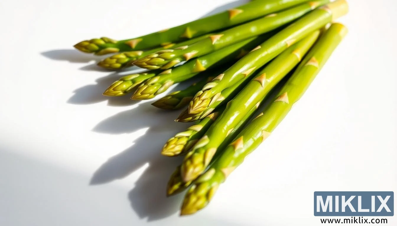 Hästi valgustatud lähivõte mahlastest rohelistest sparglivõrsetest valgel taustal, mis rõhutab nende värskust, elujõudu ja looduslikke tervisele kasulikke omadusi.