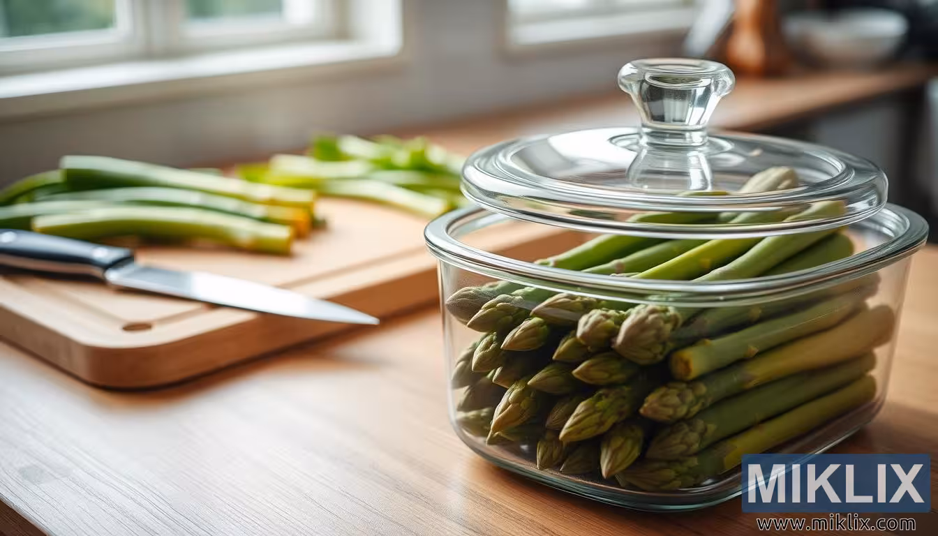 Köögilett värskete sparglivarte, klaasist hoiunõu ja lõikelauaga, rõhutades õiget säilitamist värskuse ja maitse säilitamiseks.