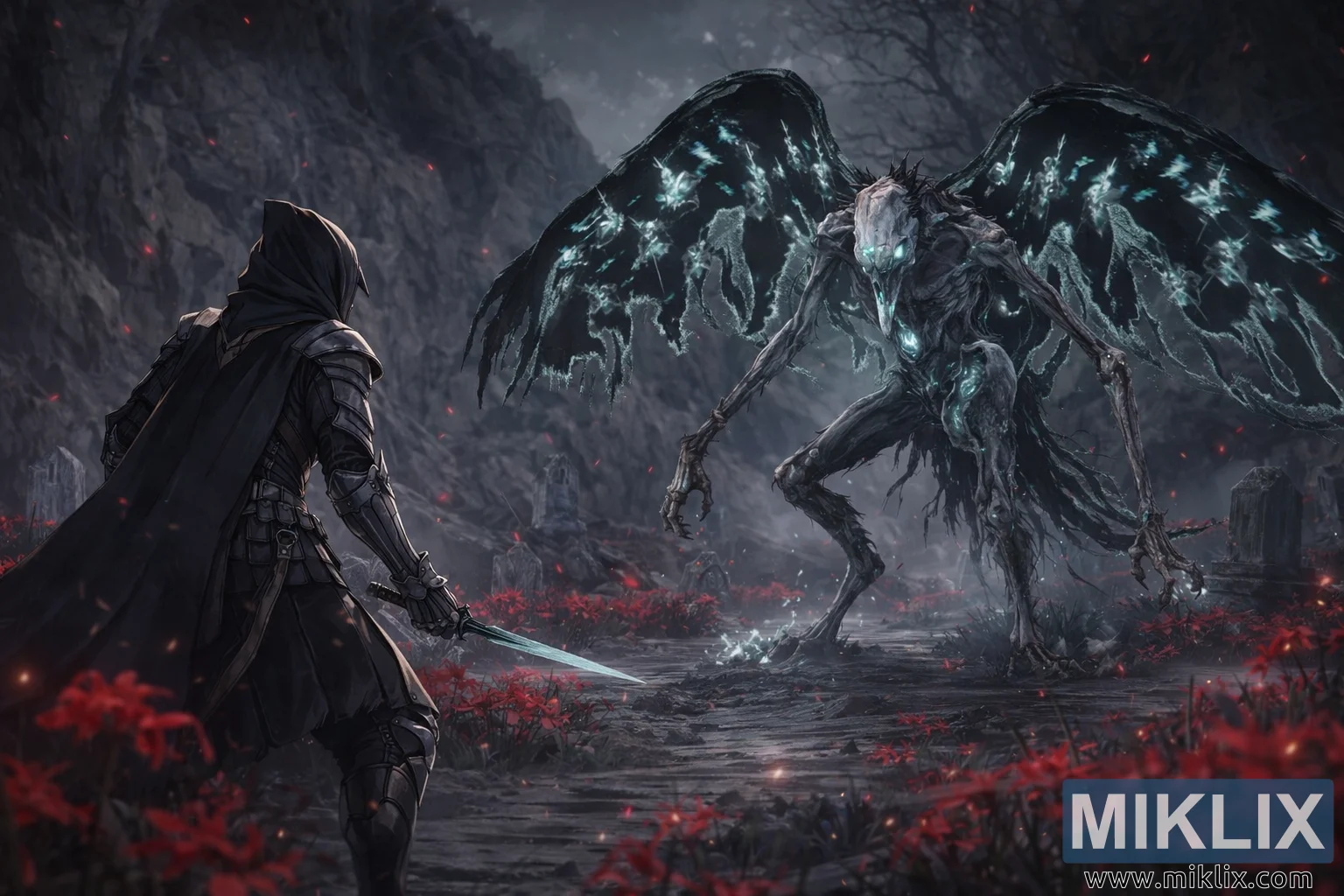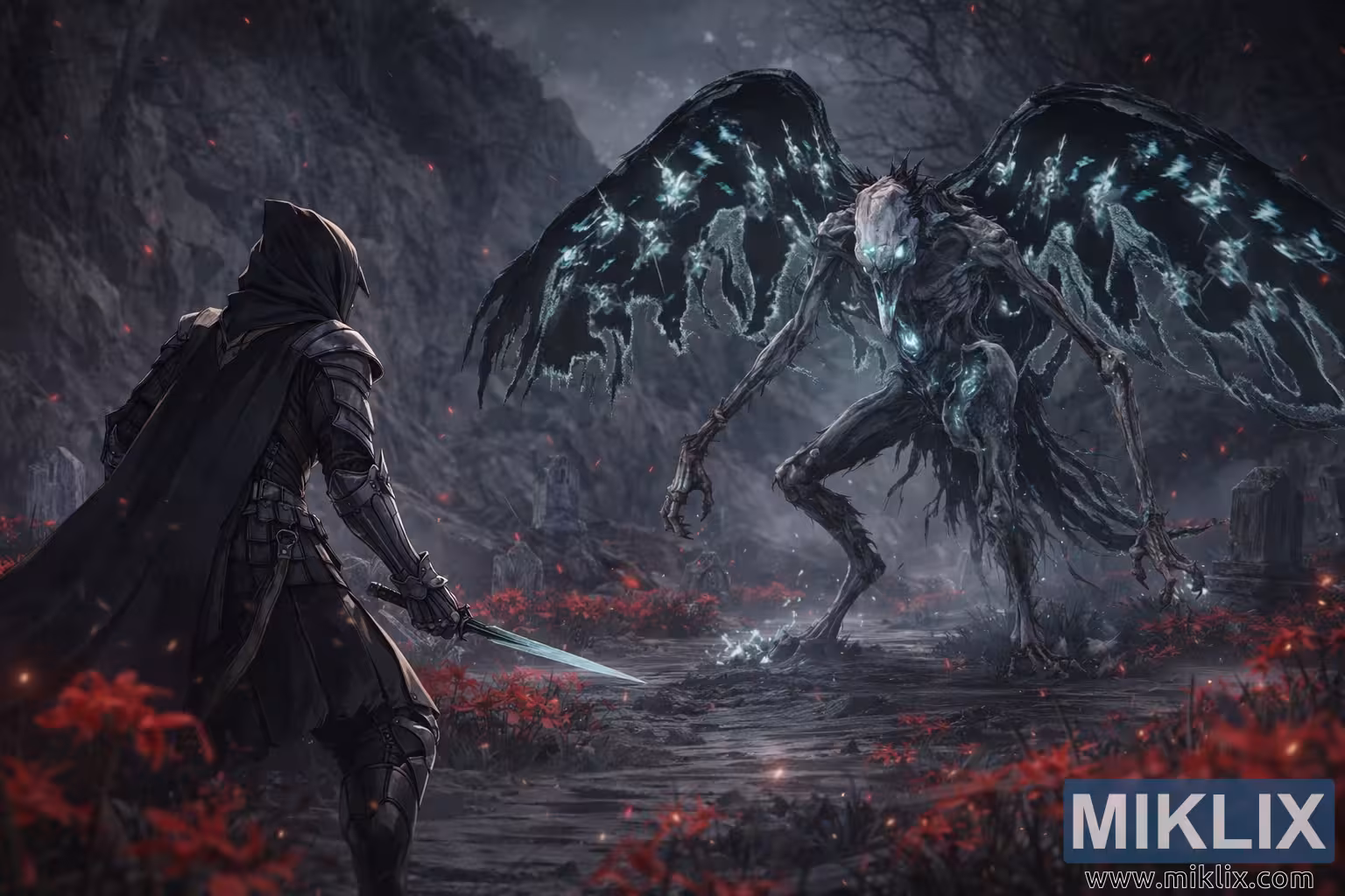 محیط، حس وحشت را عمیقتر میکند. میدان نبرد، مسیری پر از آب است که سنگ قبرهای ترکخورده و بقایای ویرانههای فراموششده در آن پراکندهاند. برکههای آب تیره، هر دو چهره را منعکس میکنند و بازتابهای آنها را به طرز نامحسوسی محو میکنند. در اطراف، مزارع گلهای سرخ در تضاد با رنگآمیزی خاموش صحنه میسوزند و گلبرگهایشان مانند جرقه یا خون در هوا شناورند. صخرههای پسزمینه با شیب تندی سر به فلک کشیدهاند و صحنه را در عرصهای خفقانآور از سنگ و سایه محصور کردهاند. آسمانی خاکستری و طوفانی از بالا به پایین فشار میآورد، پوشیده از خاکستر شناور و ذرات قرمز نور.