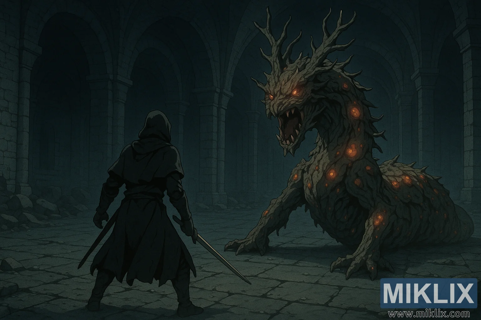 تصویرسازی فانتزی تاریک به سبک انیمه از یک جنگجوی تنهای لکهدار مانند که در دخمههای باستانی با یک مار درختی عظیم و پوسیده روبرو میشود، که با زخمهای نارنجی درخشان در امتداد بدن پوست مانند هیولا روشن شده است.