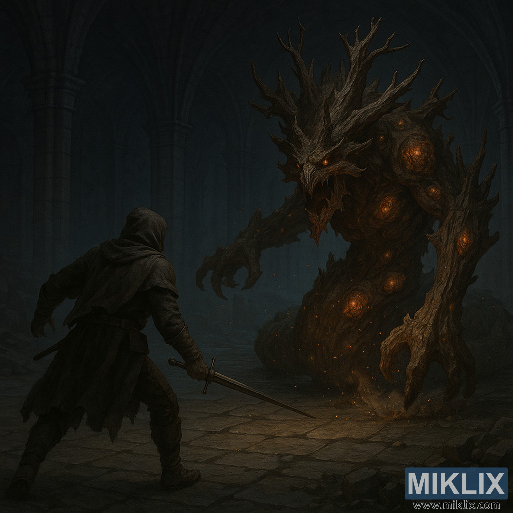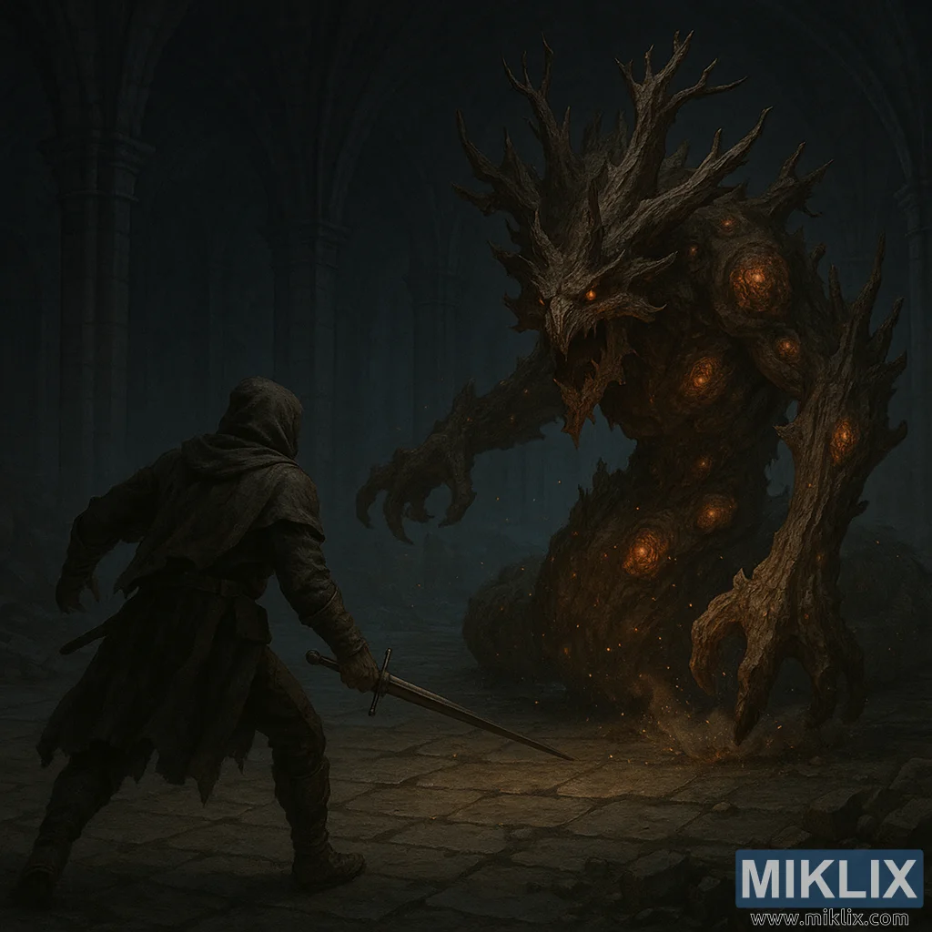 اثر هنری فانتزی تاریک واقعگرایانه از یک جنگجوی لکهدار که در دخمههای باستانی با یک هیولای درختی عظیم الجثه و زخمخورده روبرو میشود، که با پوسیدگی قارچی نارنجی میدرخشد.
