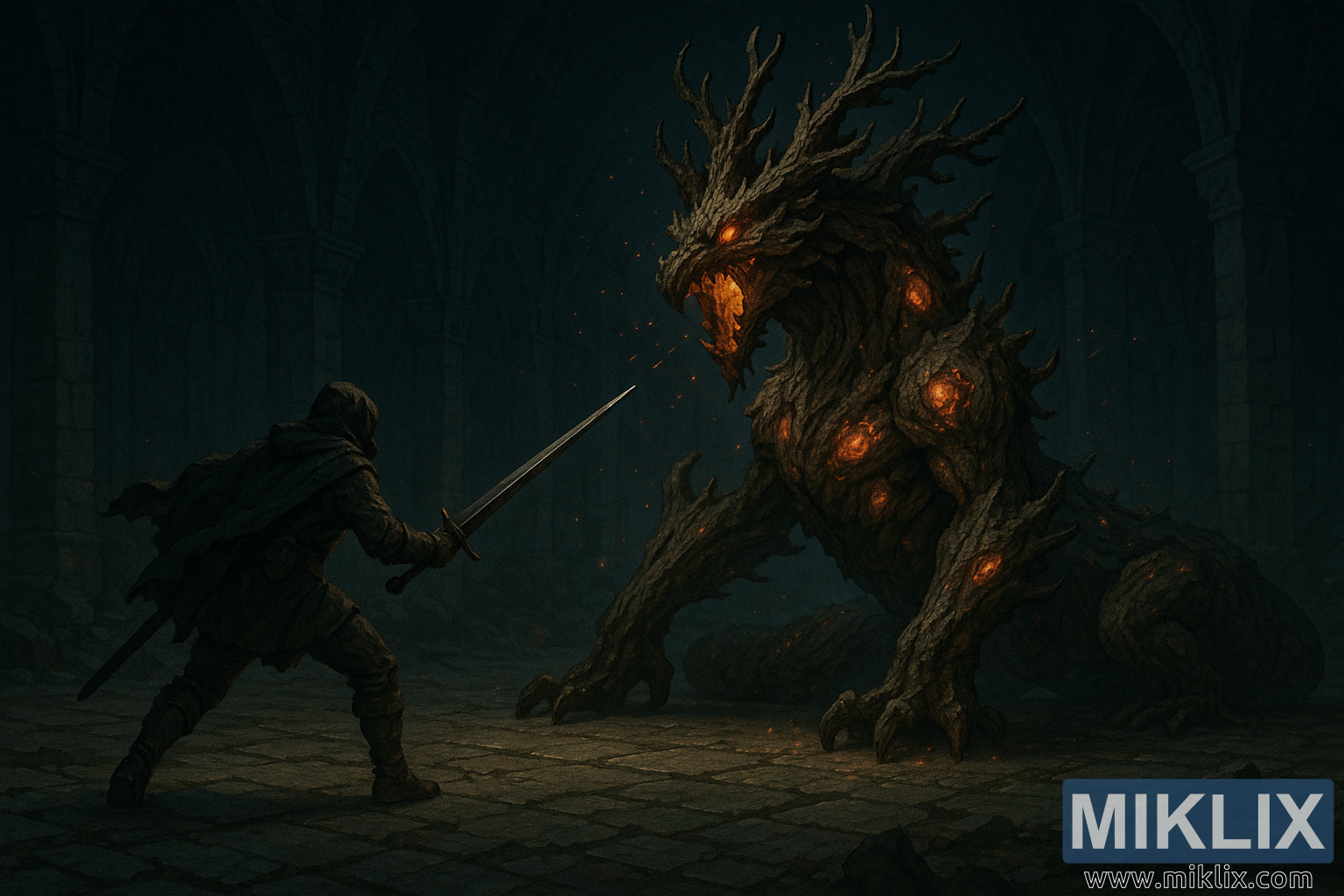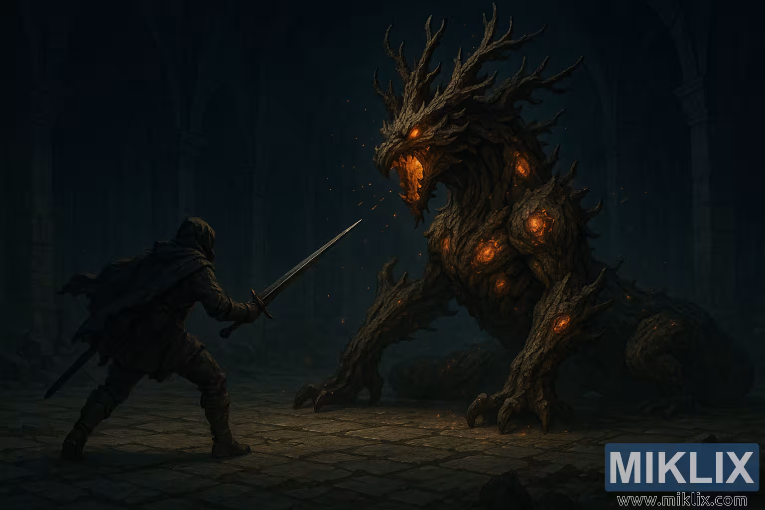 اثر هنری واقعگرایانه فانتزی تاریک از یک جنگجوی لکهدار مانند در حالت نبرد در مواجهه با یک موجود درختی عظیمالجثه و زخمخورده در یک دخمه زیرزمینی باستانی.