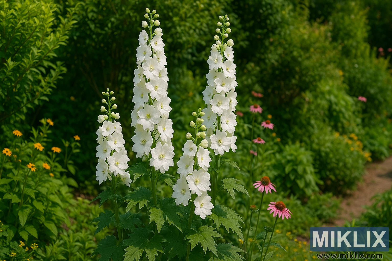 صحنهای با وضوح بالا از باغ دلفینیوم «گالاهاد» با گلهای سفید بلند که در حاشیهای سرسبز به سبک کلبه رشد کردهاند و با گلهای مخروطی، رودبکیا و گیاهان سبز لایه لایه احاطه شدهاند.