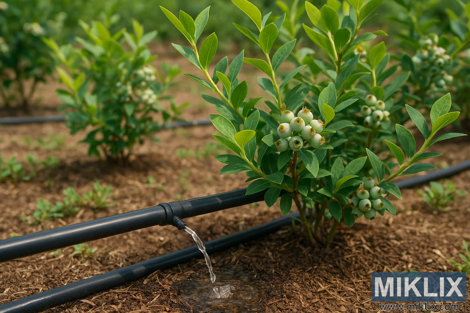 Drip Irrigation System Watering Blueberry Bushes in a Lush Orchard