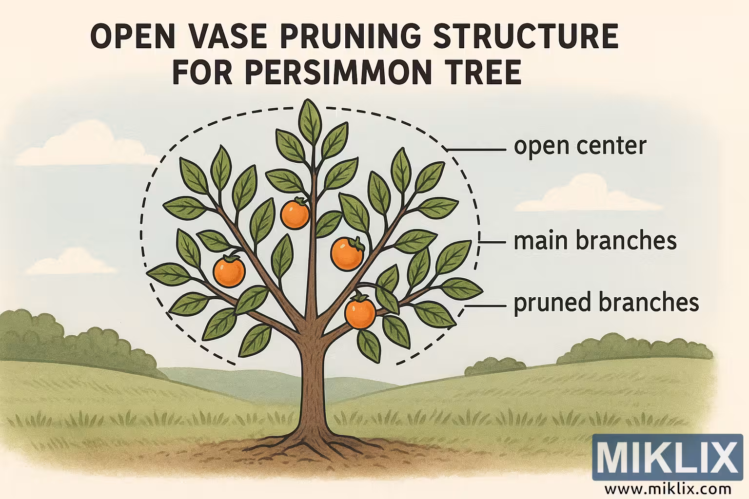 این تصویر آموزشی، ساختار ایدهآل هرس گلدانی باز برای درخت خرمالو را به تصویر میکشد که برای راهنمایی باغداران، باغبانان و دانشجویان باغبانی در آموزش و نگهداری صحیح درخت طراحی شده است. این نمودار در جهت منظره با تُنهای ملایم و طبیعی، در مقابل پسزمینه روستایی سبکمند تپههای سبز مواج و آسمان آبی روشن ارائه شده است. این صحنه، وضوح و هماهنگی را منتقل میکند و منعکسکننده تعادل ساختار و رشد حاصل از شیوههای صحیح هرس است.