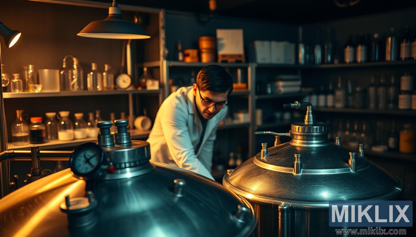 یک تکنسین در آزمایشگاهی کمنور، که اطرافش را ابزار و تجهیزات دمآوری فرا گرفته، در حال بررسی یک مخزن تخمیر از جنس فولاد ضد زنگ است.