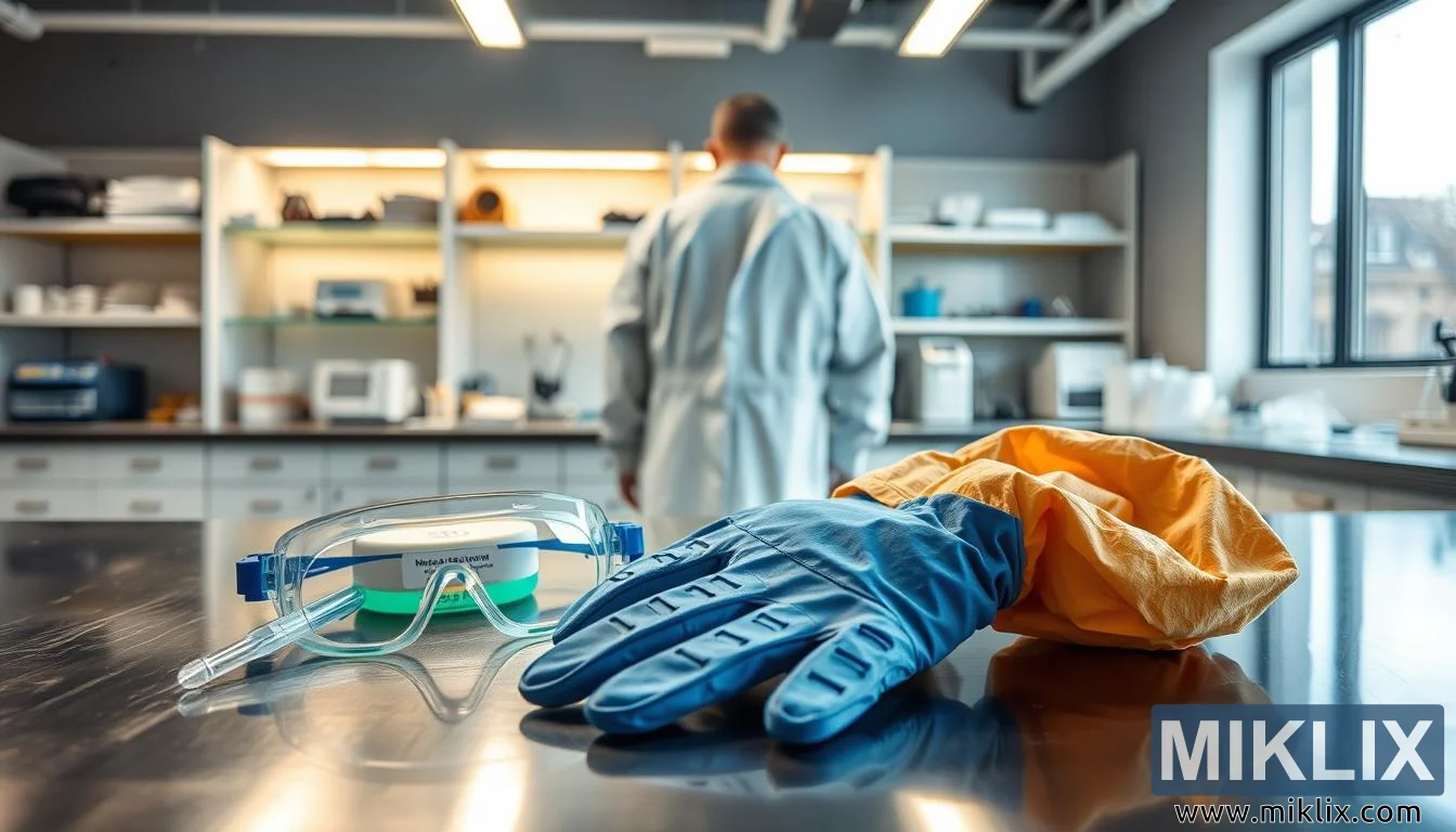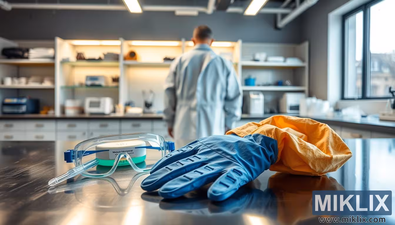 یک آزمایشگاه مدرن با تجهیزات ایمنی و نمونه مخمر، که شیوههای صحیح کار با ساکارومایسس دیاستاتیکوس را برجسته میکند.