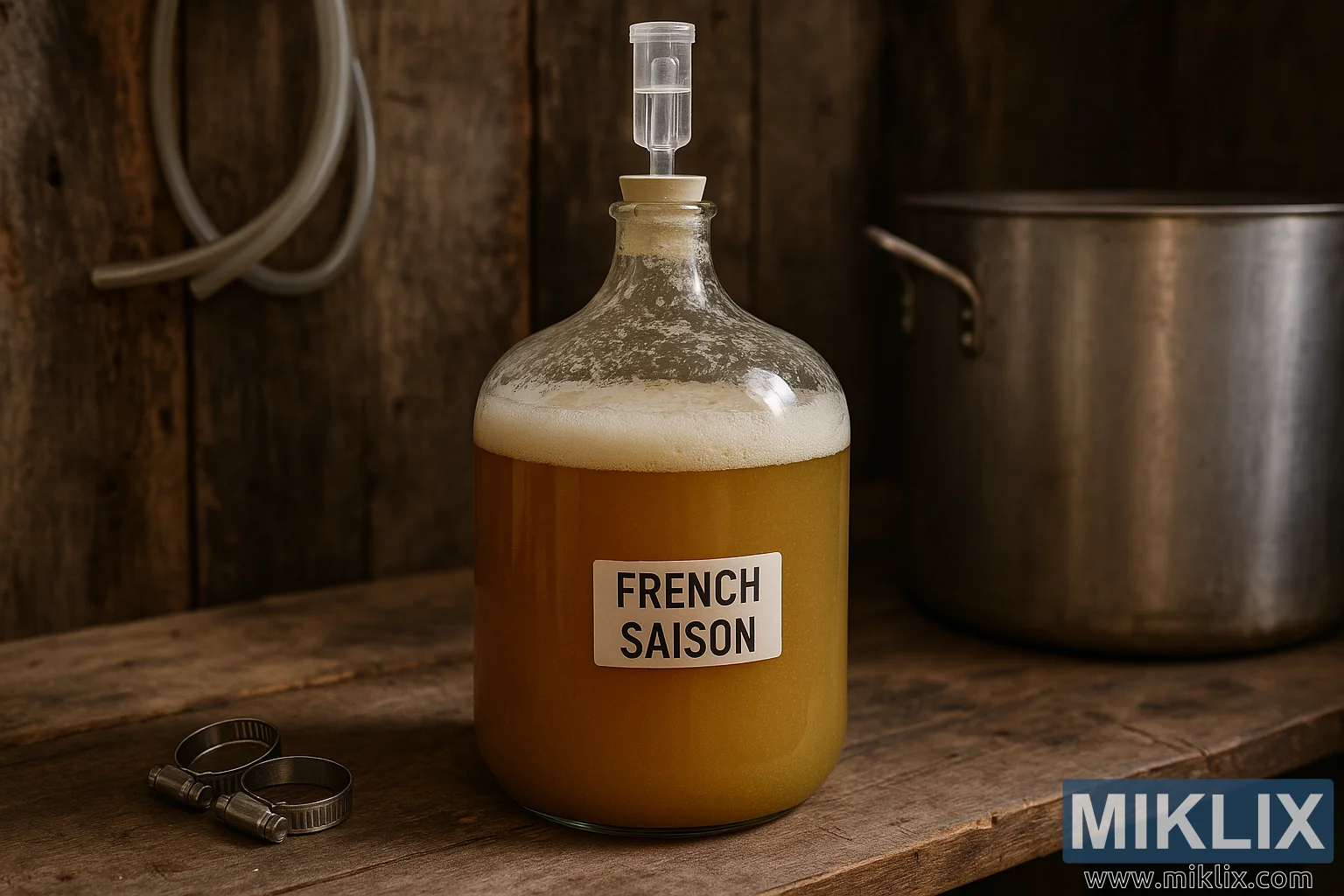 یک آبجوی فرانسوی سیزون در یک کاربوی شیشهای در یک محیط خانگی روستایی تخمیر میشود. مایع طلایی و مهآلود، کراوزن کفآلود و ابزارهای دمآوری، سنت و هنر آبجوسازی در مزرعه را تداعی میکنند.
