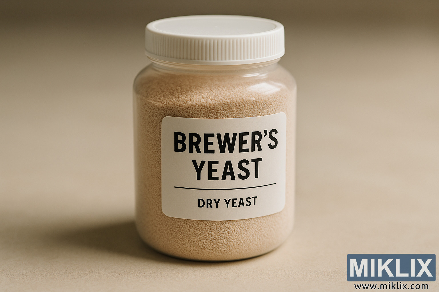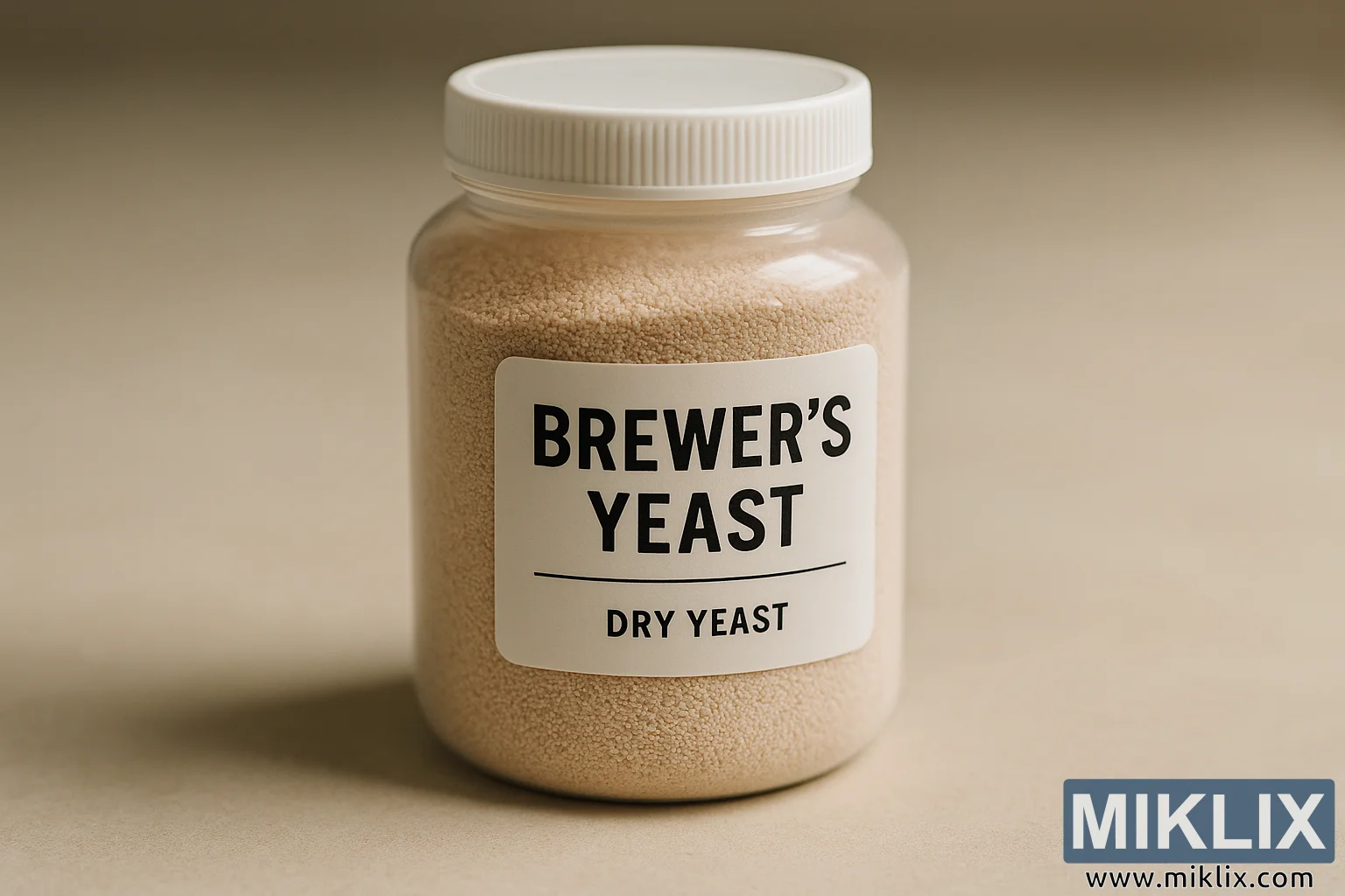 نمای نزدیک با وضوح بالا از یک ظرف دربسته حاوی مخمر آبجوی خشک روی یک سطح خنثی. نور ملایم و پراکنده، برچسبگذاری تمیز، گرانولهای ریز و نگهداری مناسب برای تخمیر مطمئن را برجسته میکند.